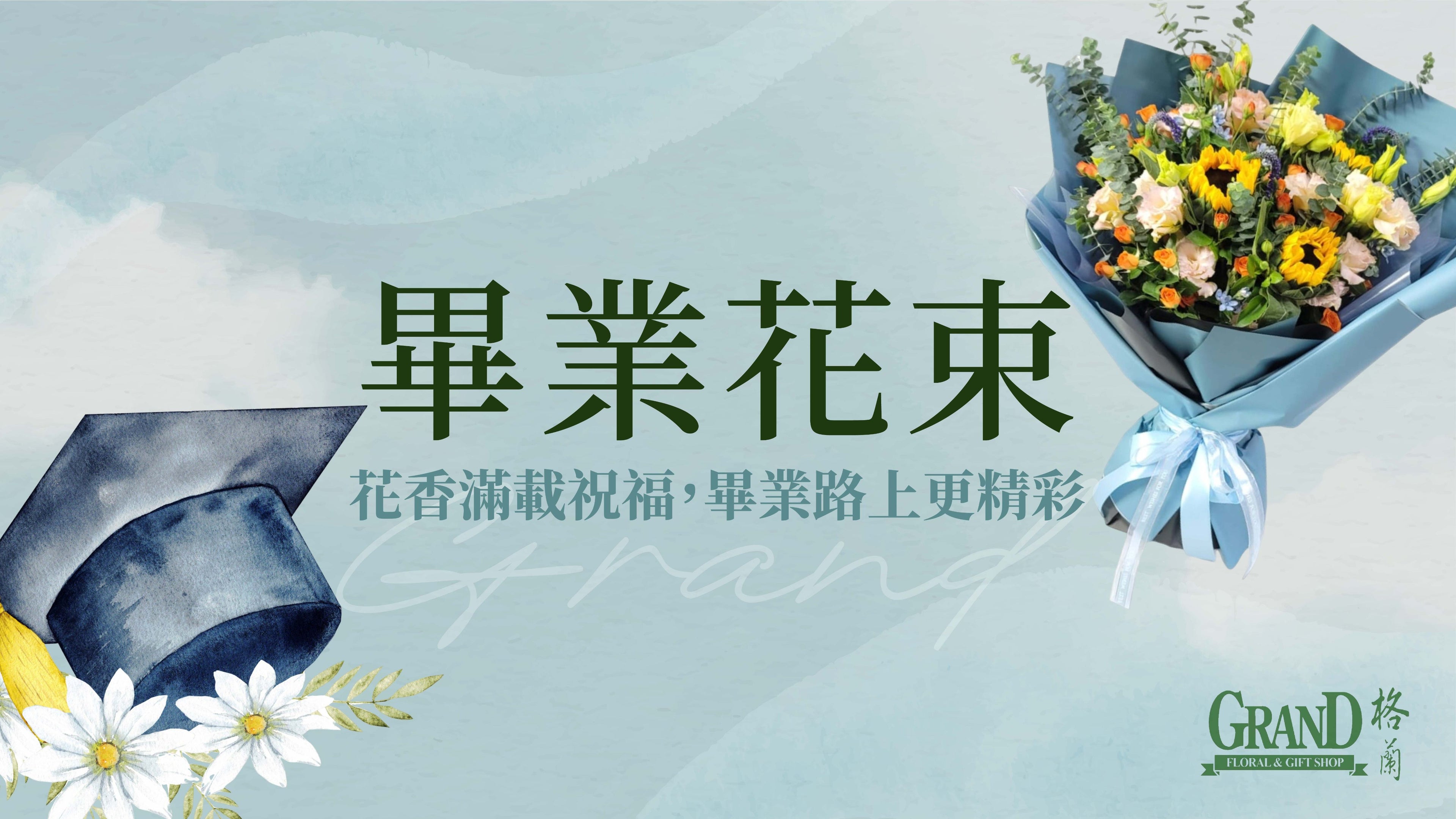 格蘭花店 - 鮮花花束 (香檳玫瑰6支、向日葵3支、BB草、桔梗及油加利果) [GF00194]
