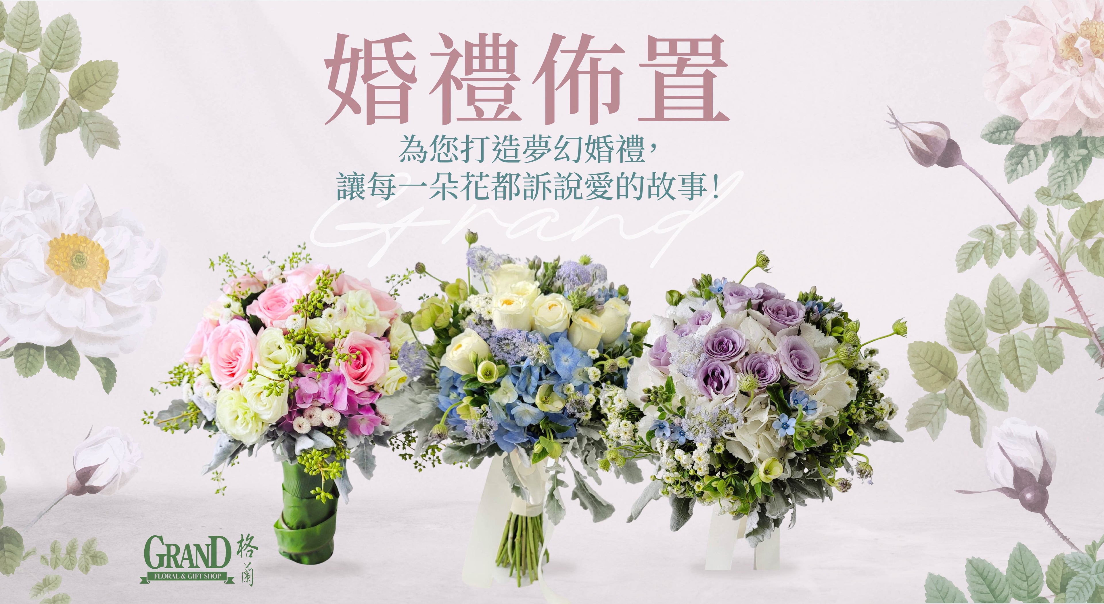 格蘭花店擁有數十年專業設計及佈置經驗,致力於為每一場婚禮打造獨特而浪漫的氛圍。我們深知婚禮是人生中最重要的時刻之一,因此提供專業的婚禮佈置服務,讓您的大日子更加完美動人。