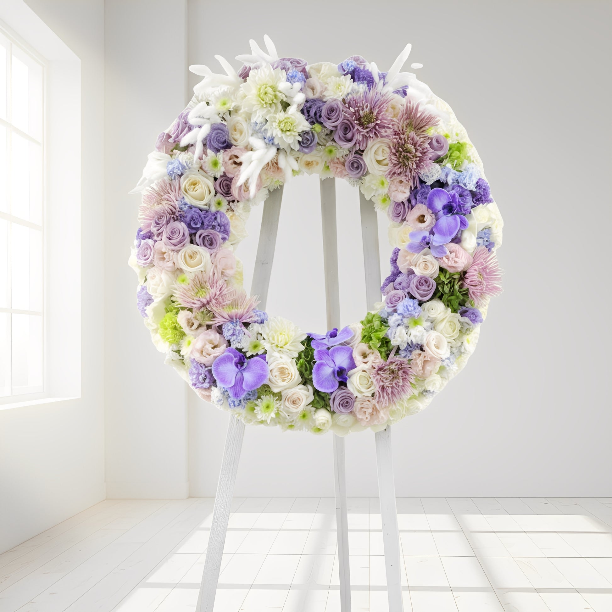 格蘭花店 - 白事花圈 (玫瑰、桔梗、、染色小丁、小菊、菊花、蝴蝶蘭、繡球花及其他襯花) [FW025] 喪禮 殯儀 告別式 追思會