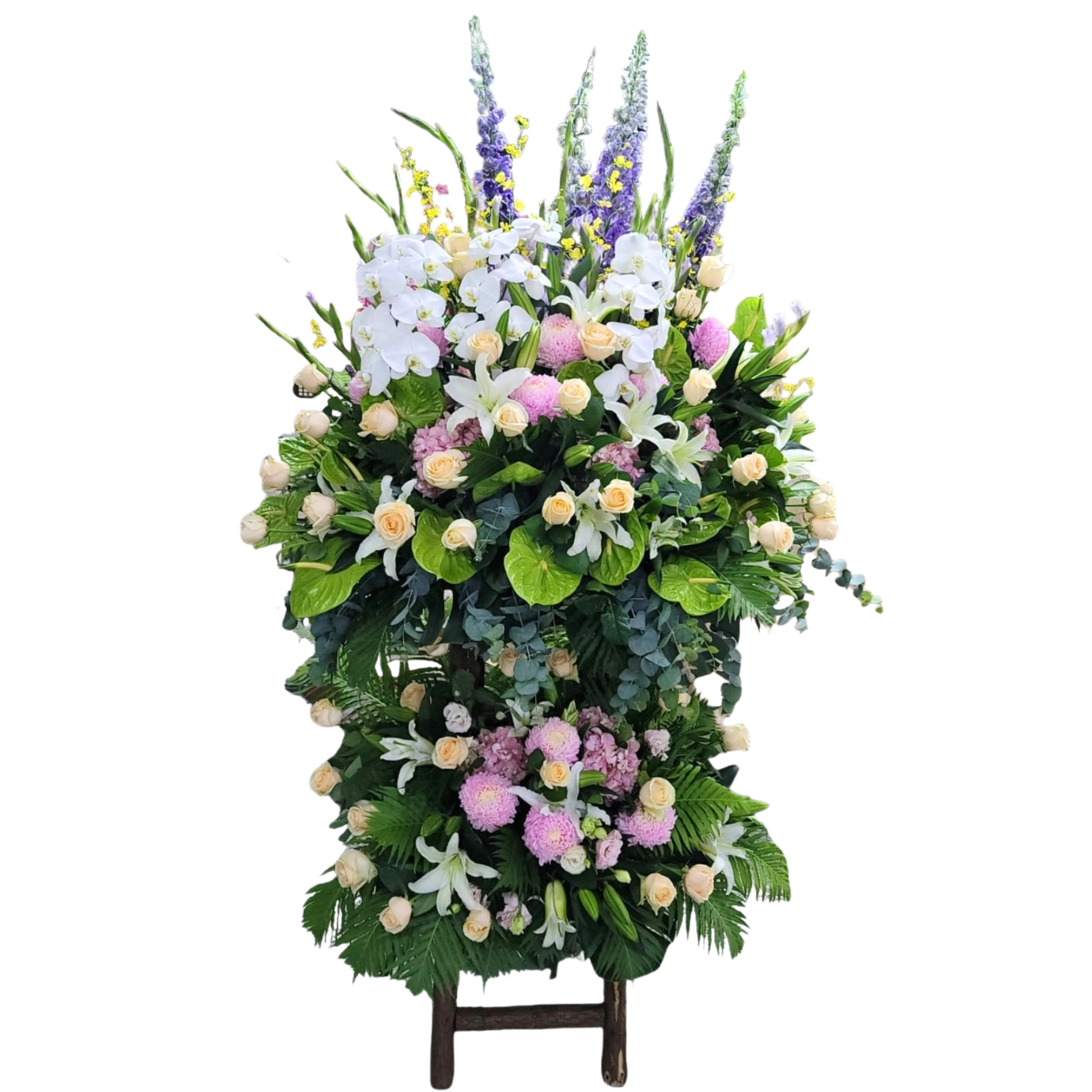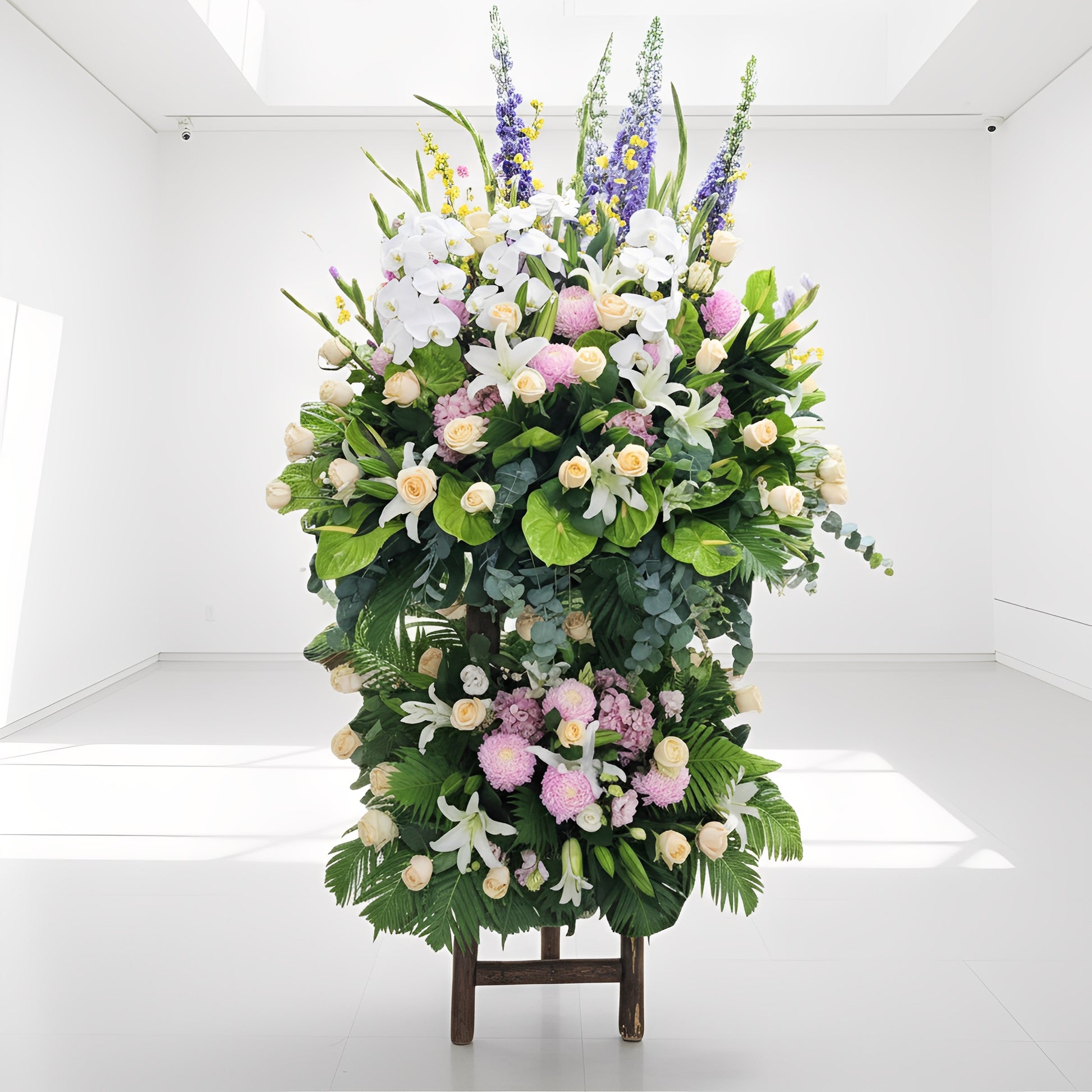 格蘭花店 - 白事花籃 (大飛燕草、跳舞蘭、蝴蝶蘭、牡丹菊、白百合、綠大掌、繡球花、玫瑰、大尤加莉葉及襯花) [FS0025] 喪禮 殯儀 告別式 追思會