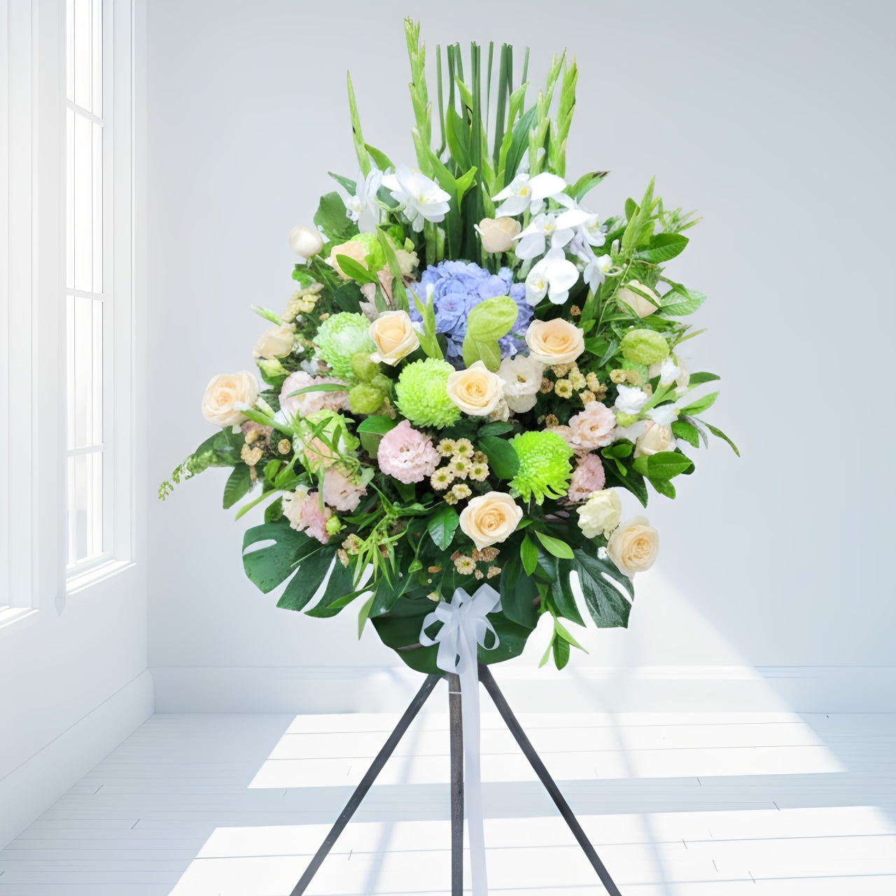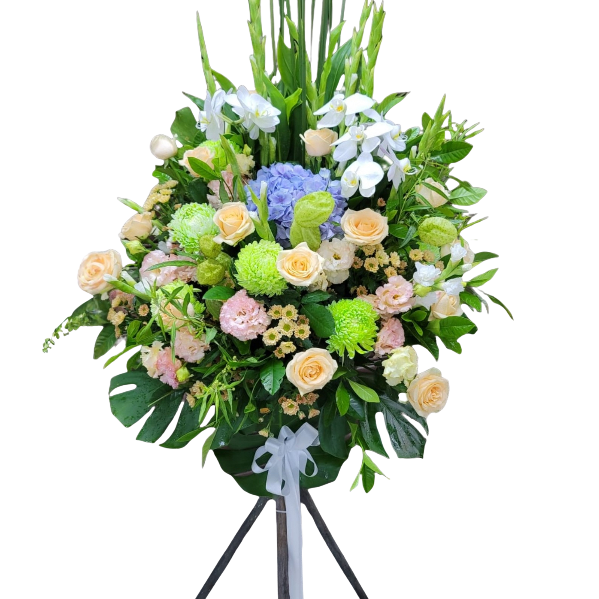 格蘭花店 - 白事花籃 (水竹草、劍蘭、繡球花、蝴蝶蘭、牡丹菊、糖棉、玫瑰、桔梗、小菊及襯花) [FS0018] 喪禮 殯儀 告別式 追思會