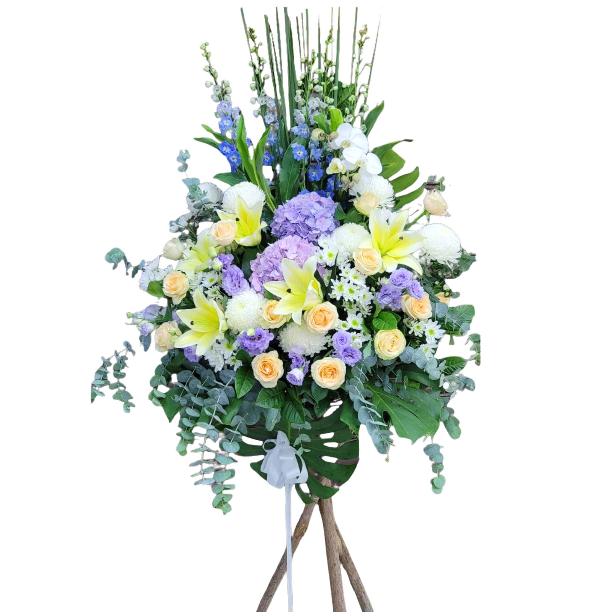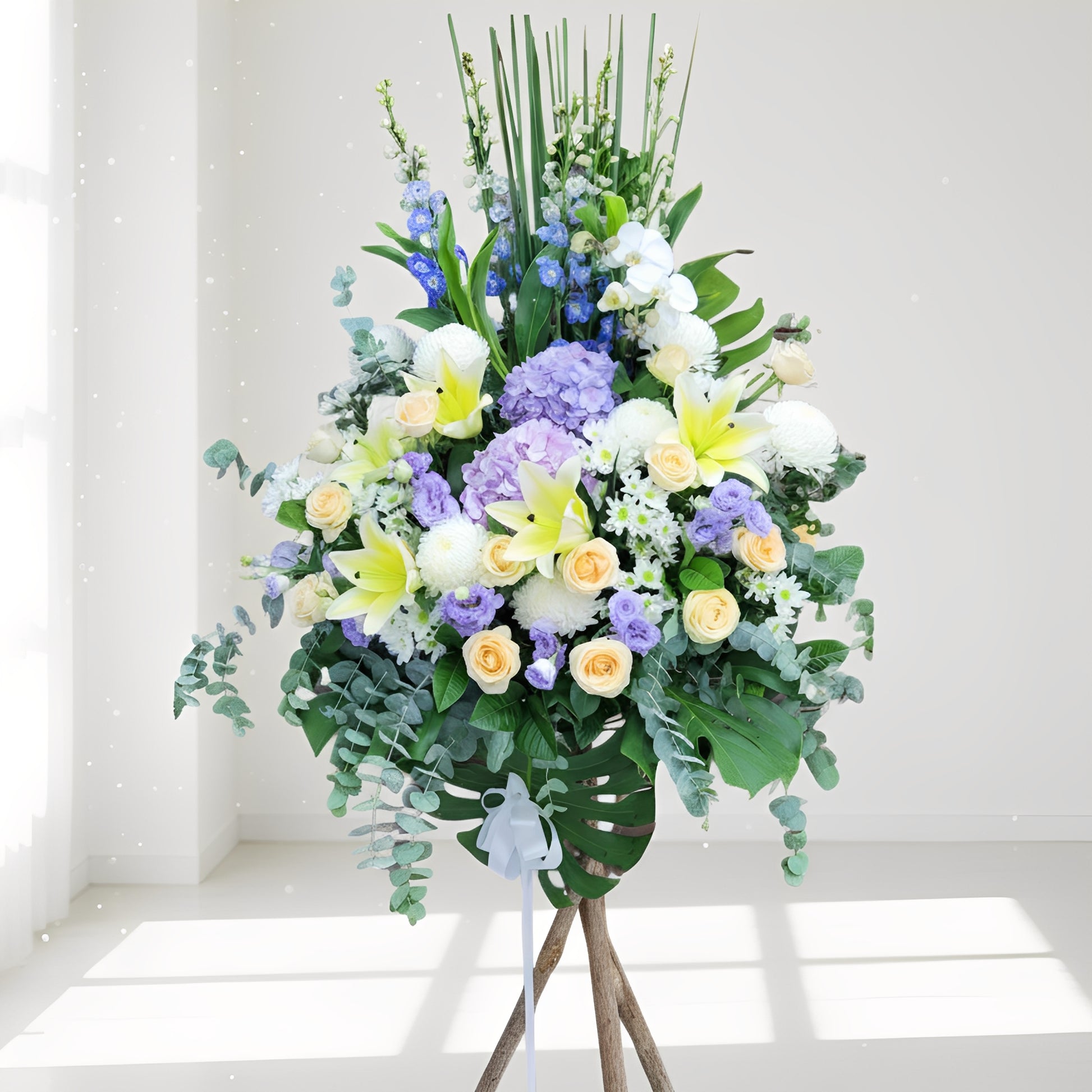 格蘭花店 - 白事花籃 (水竹草、大飛燕、蝴蝶蘭、繡球花、大波菊、玫瑰、桔梗、小菊、大尤加莉葉及襯花) [FS0022] 喪禮 殯儀 告別式 追思會