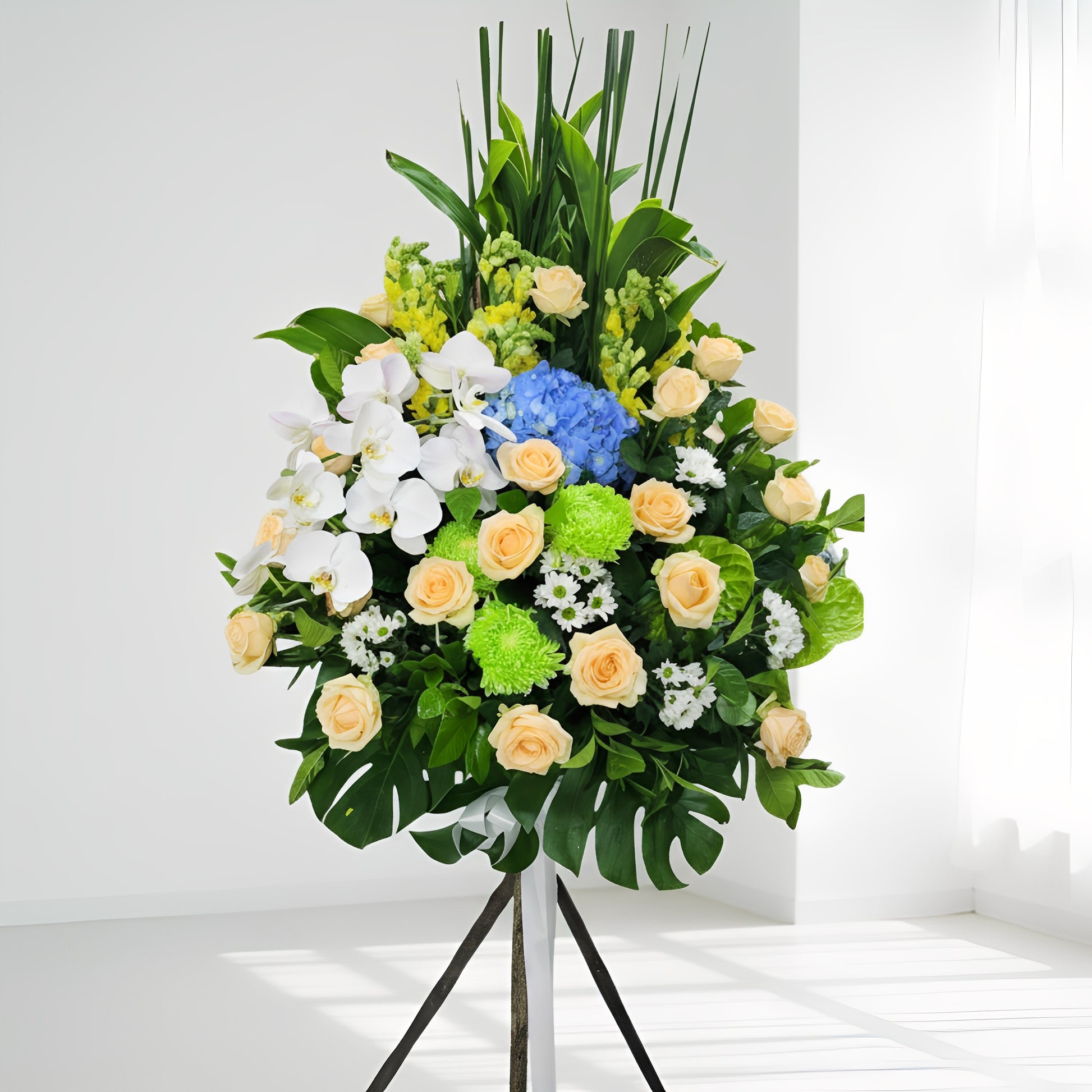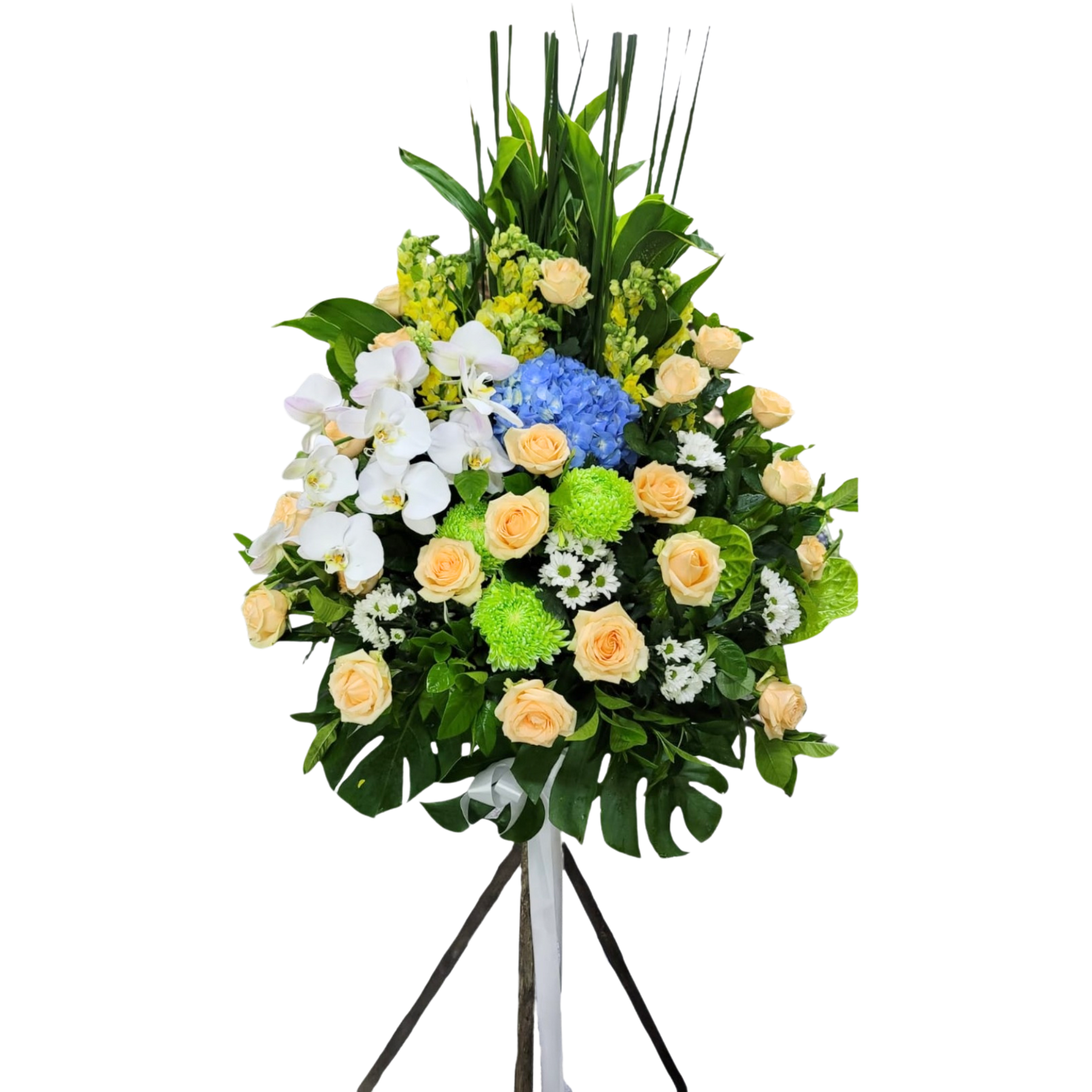 格蘭花店 - 白事花籃 (水竹草、金魚草、綠掌、牡丹菊、蝴蝶蘭、青鐵、小菊及襯花) [FS0023] 喪禮 殯儀 告別式 追思會