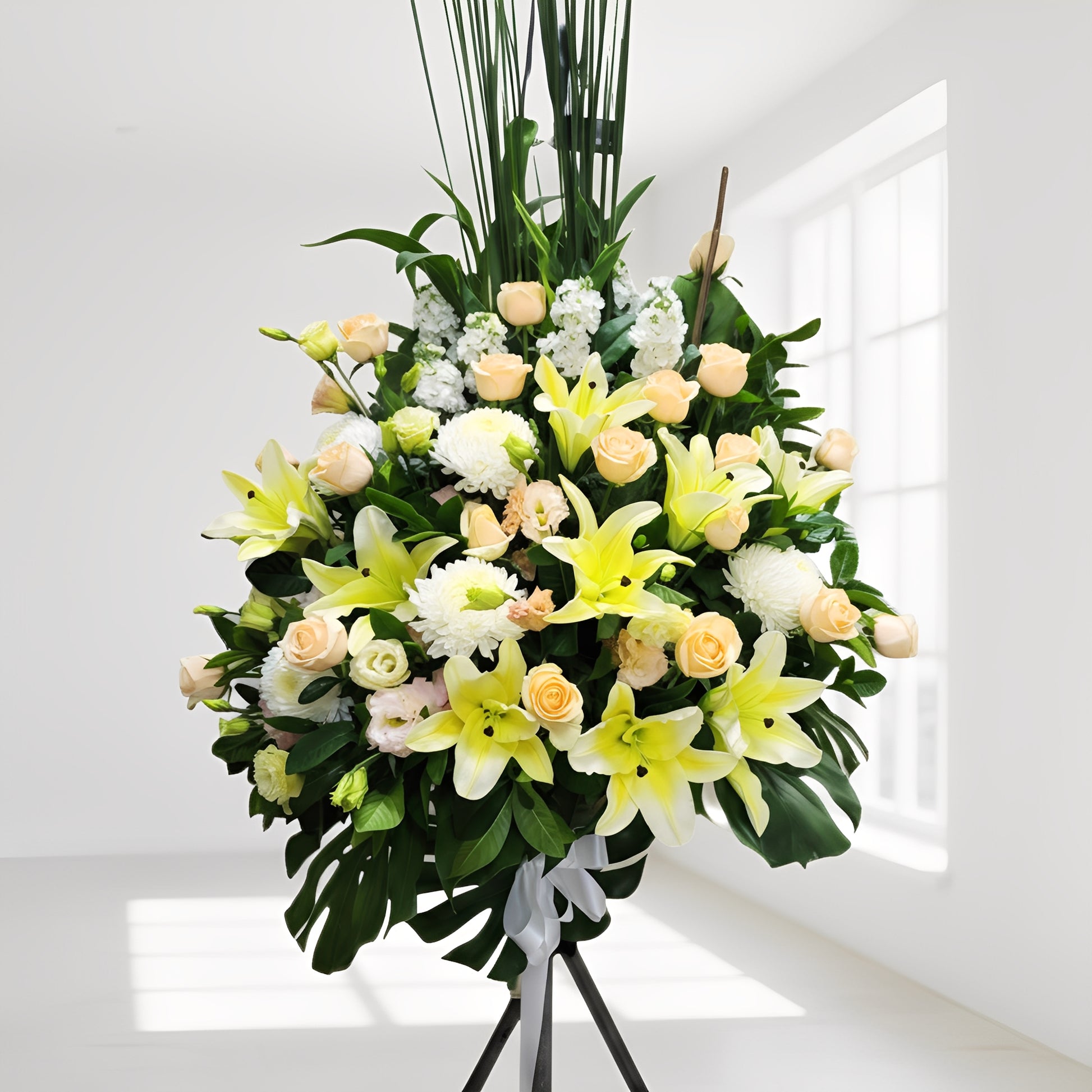 格蘭花店 - 白事花籃 (水竹草、青鐵、日本麝香、牡丹菊、玫瑰、黃天霸、桔梗及襯花) [FS0024] 喪禮 殯儀 告別式 追思會