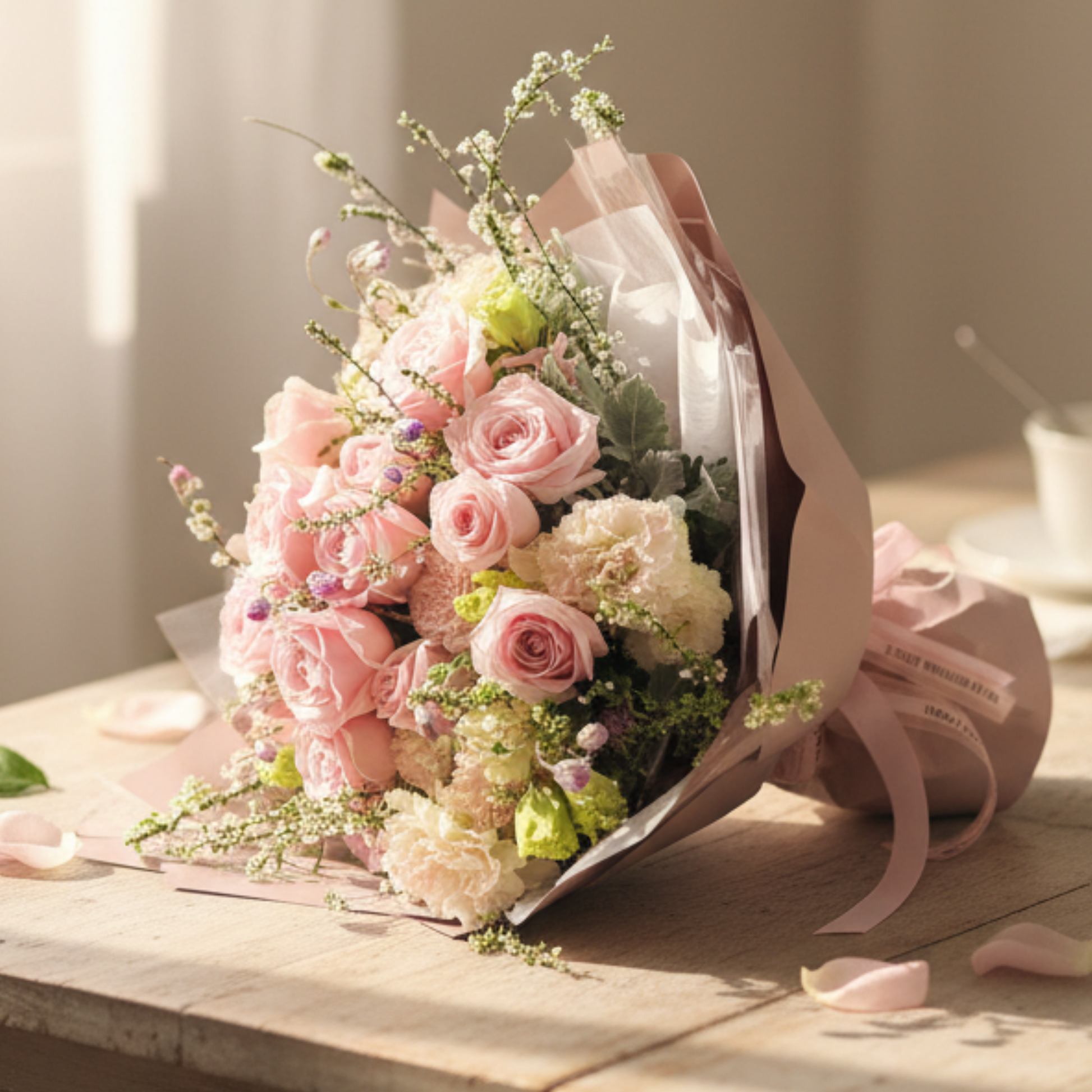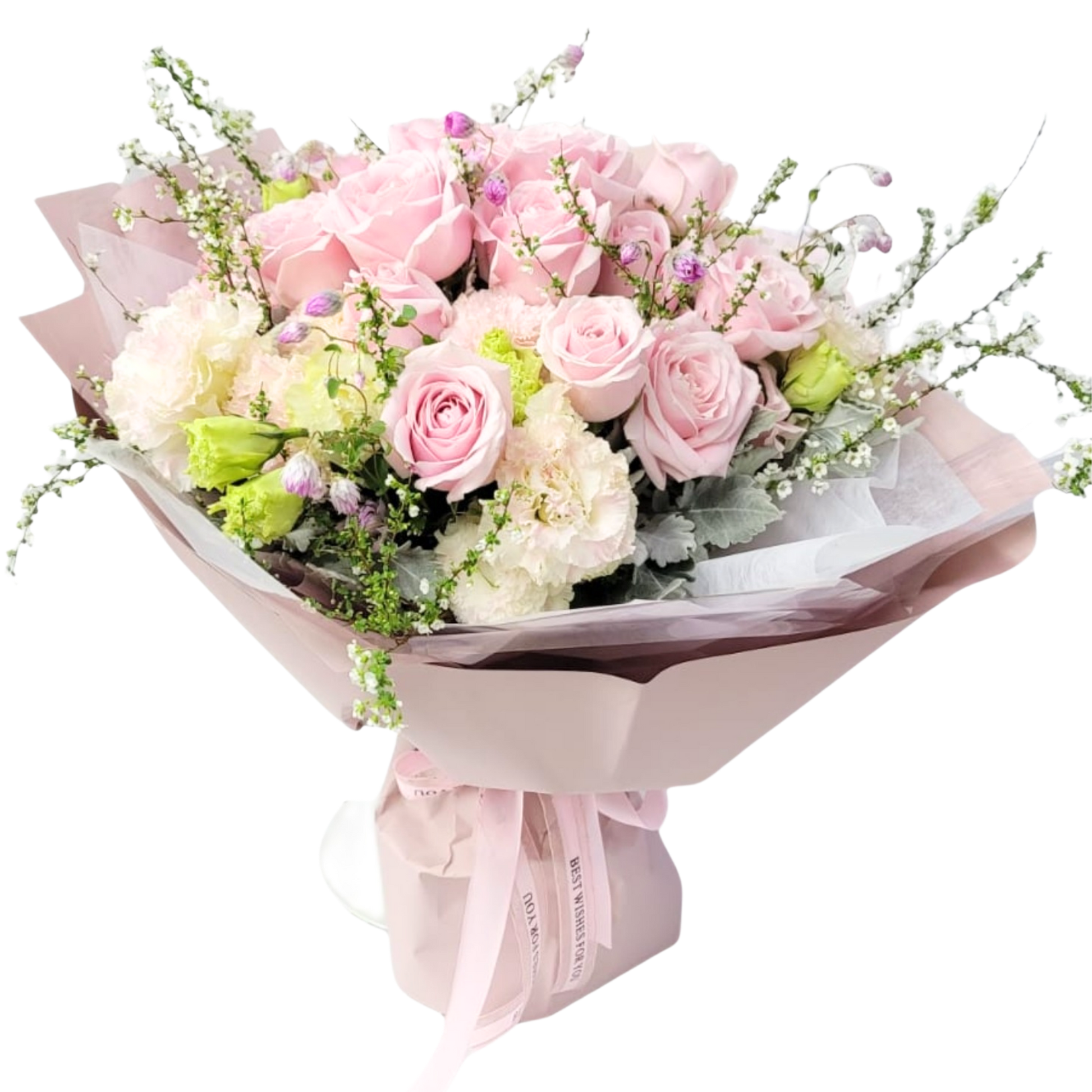 格蘭花店 - 鮮花花束 (玫瑰16枝、桔梗、雪柳、米娜葉及其他襯花) [FB056]