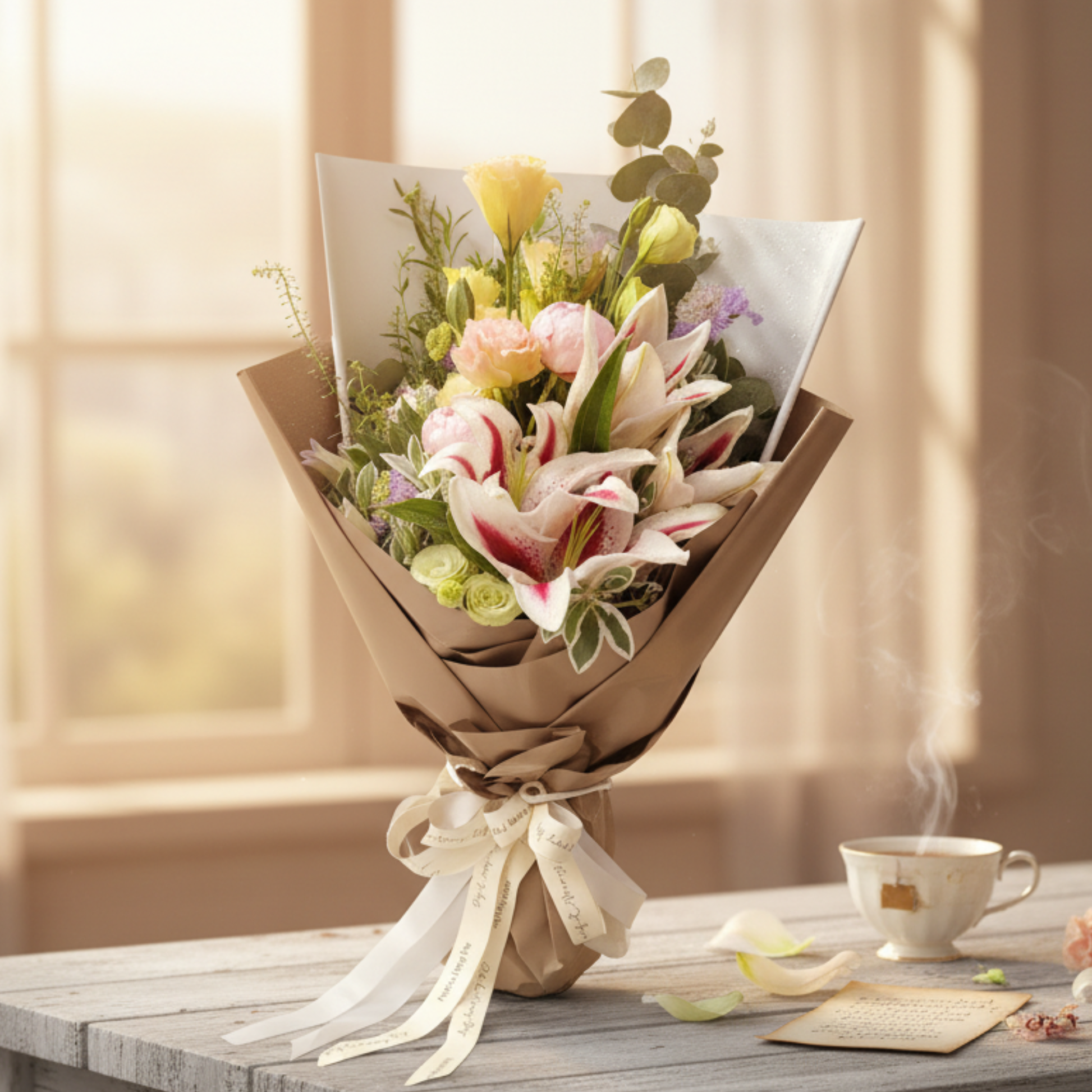 格蘭花店 - 鮮花花束 (白合、桔梗及其他襯花) [FB076]