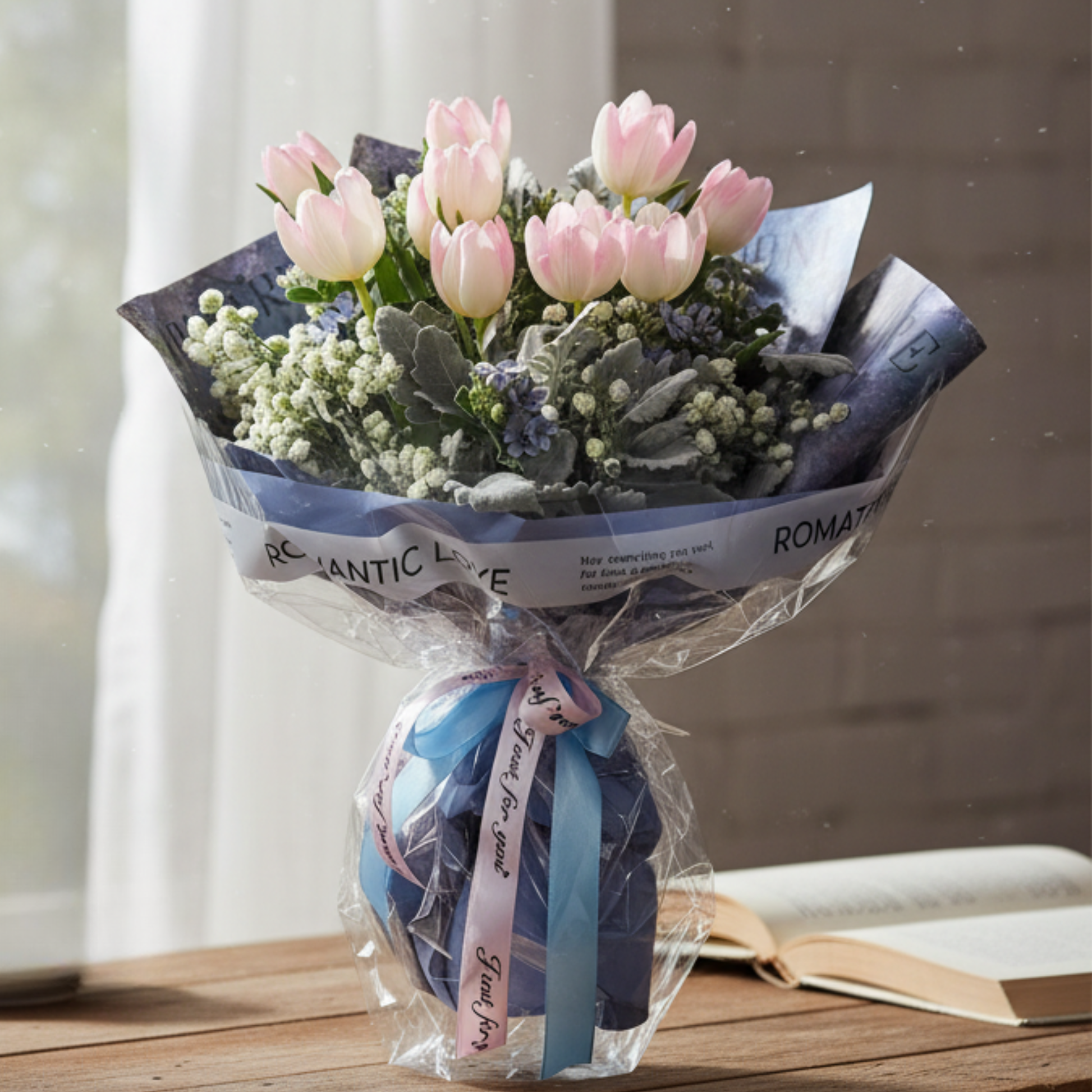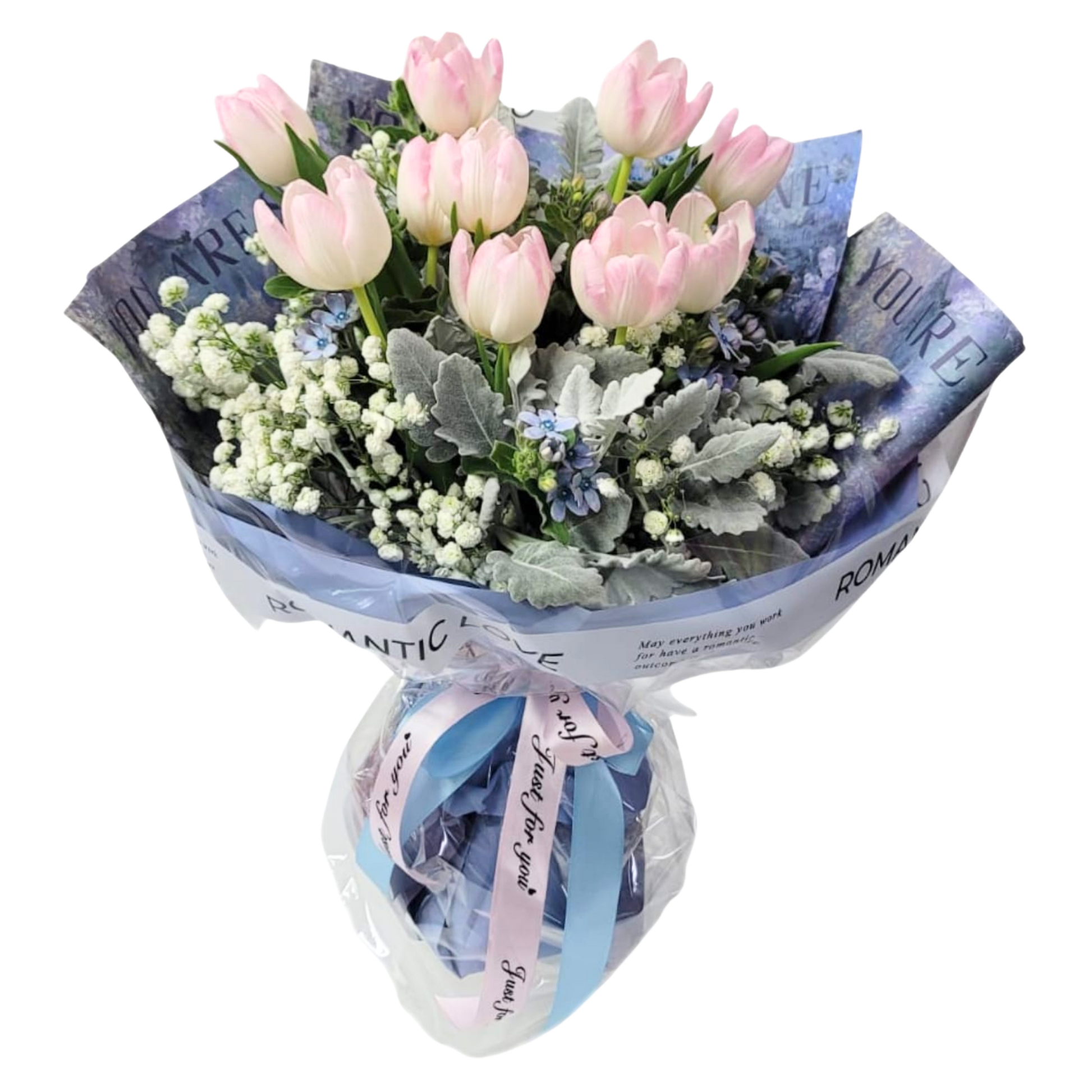 產品素材:鬱金香10枝、藍星花、滿天星、米娜葉及其他襯花