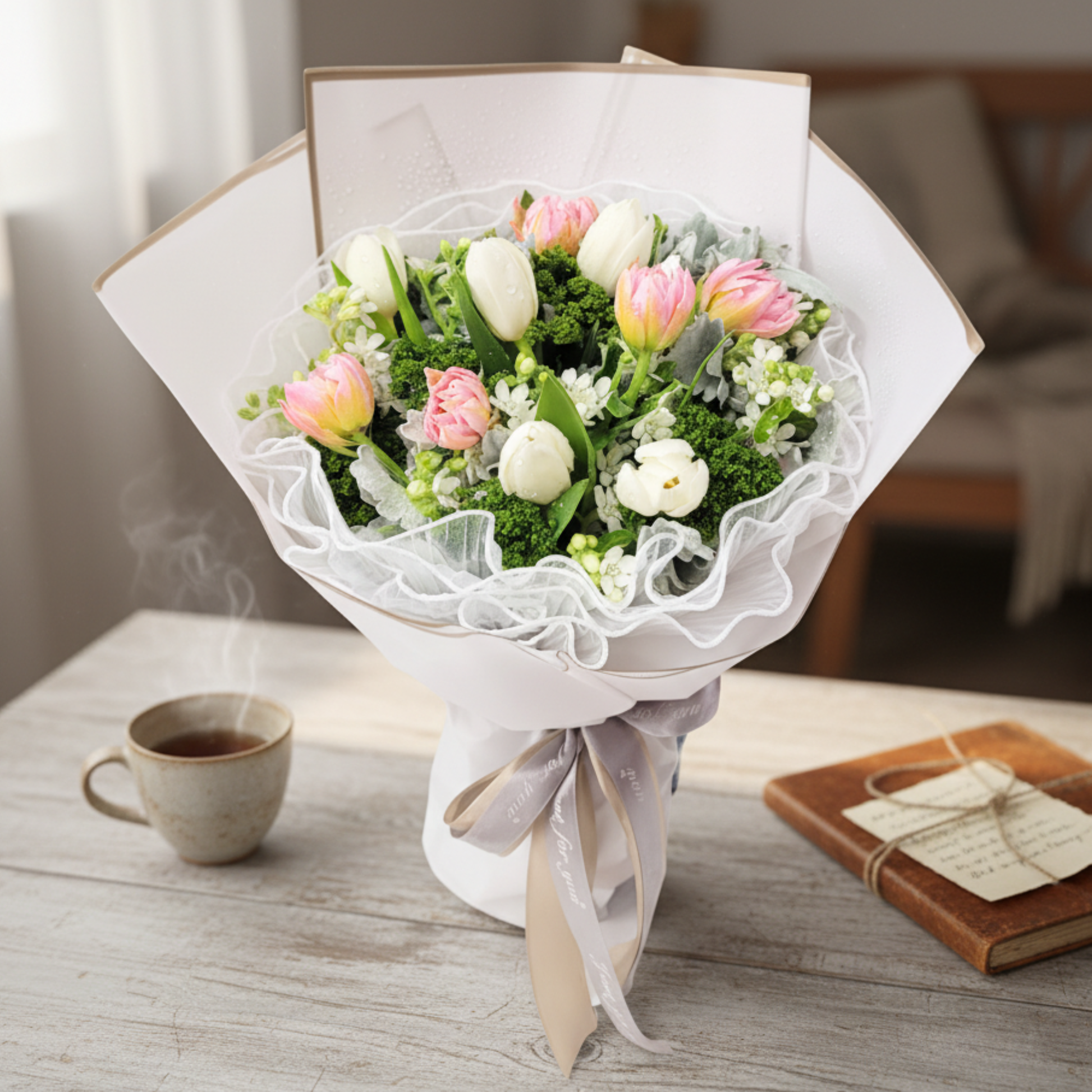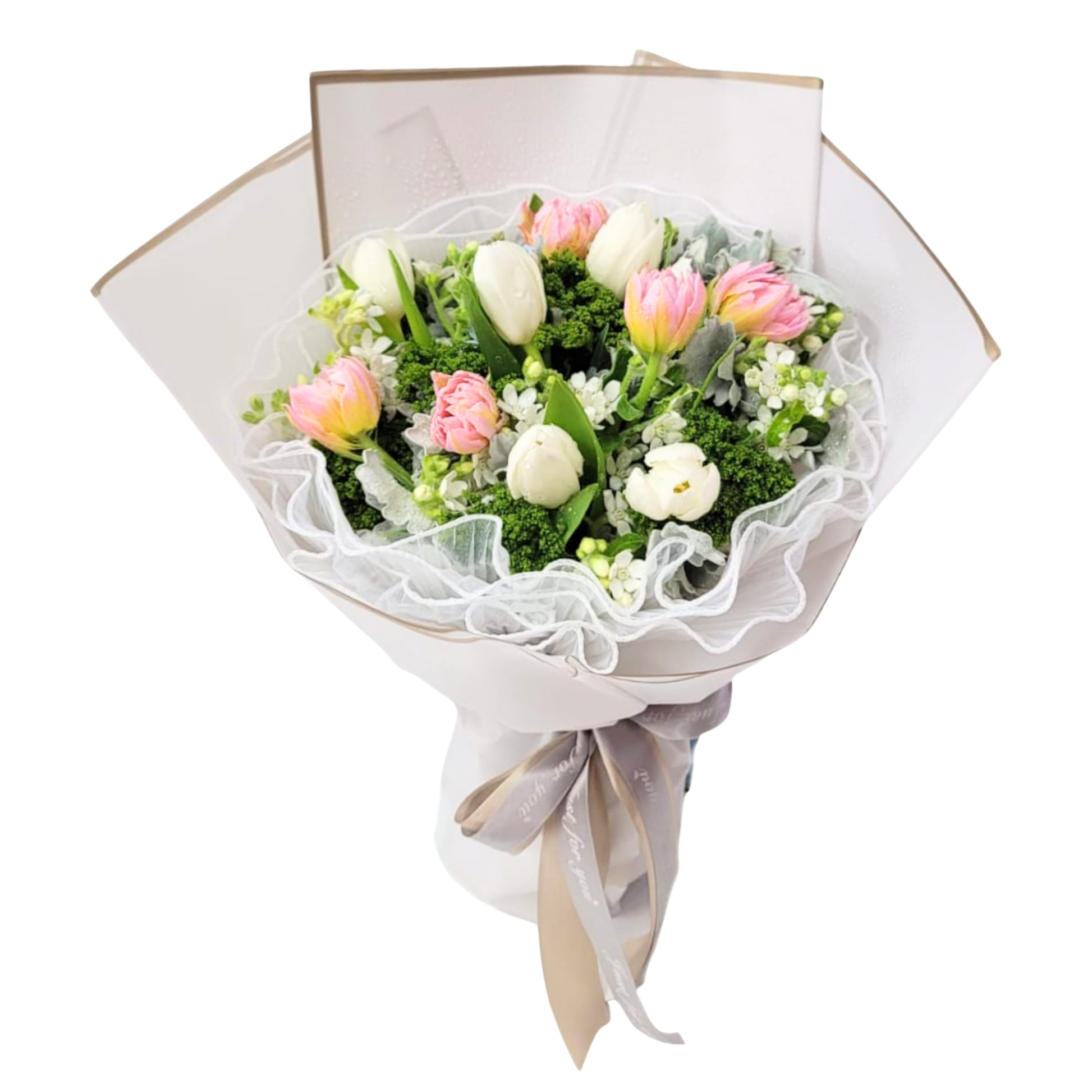 格蘭花店 - 鮮花花束 (鬱金香10枝、白星花、米娜葉及其他襯花) [FB084]