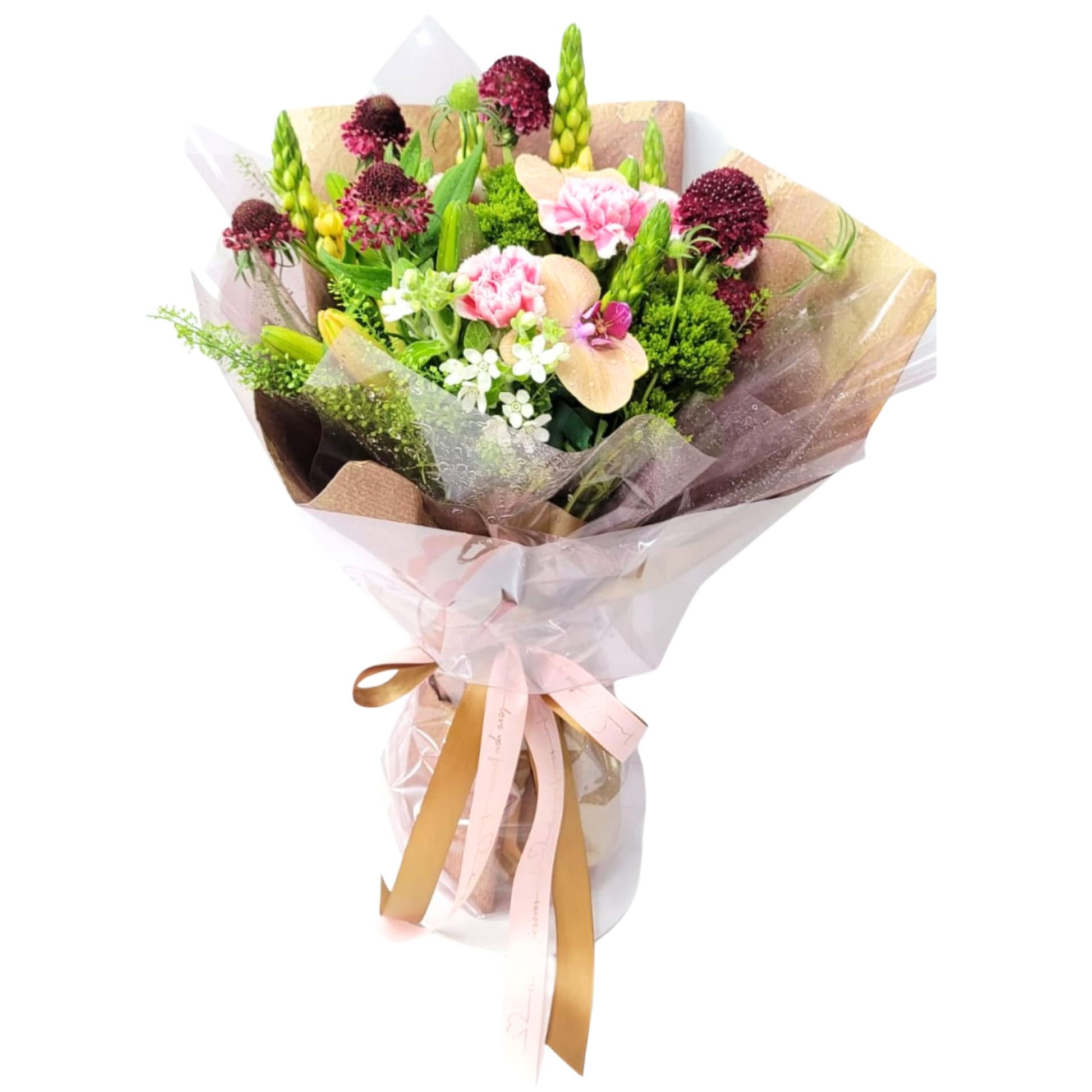 格蘭花店 - 鮮花花束 (康乃馨、白星花、白合、蟲蟲草及其他襯花) [FB086]