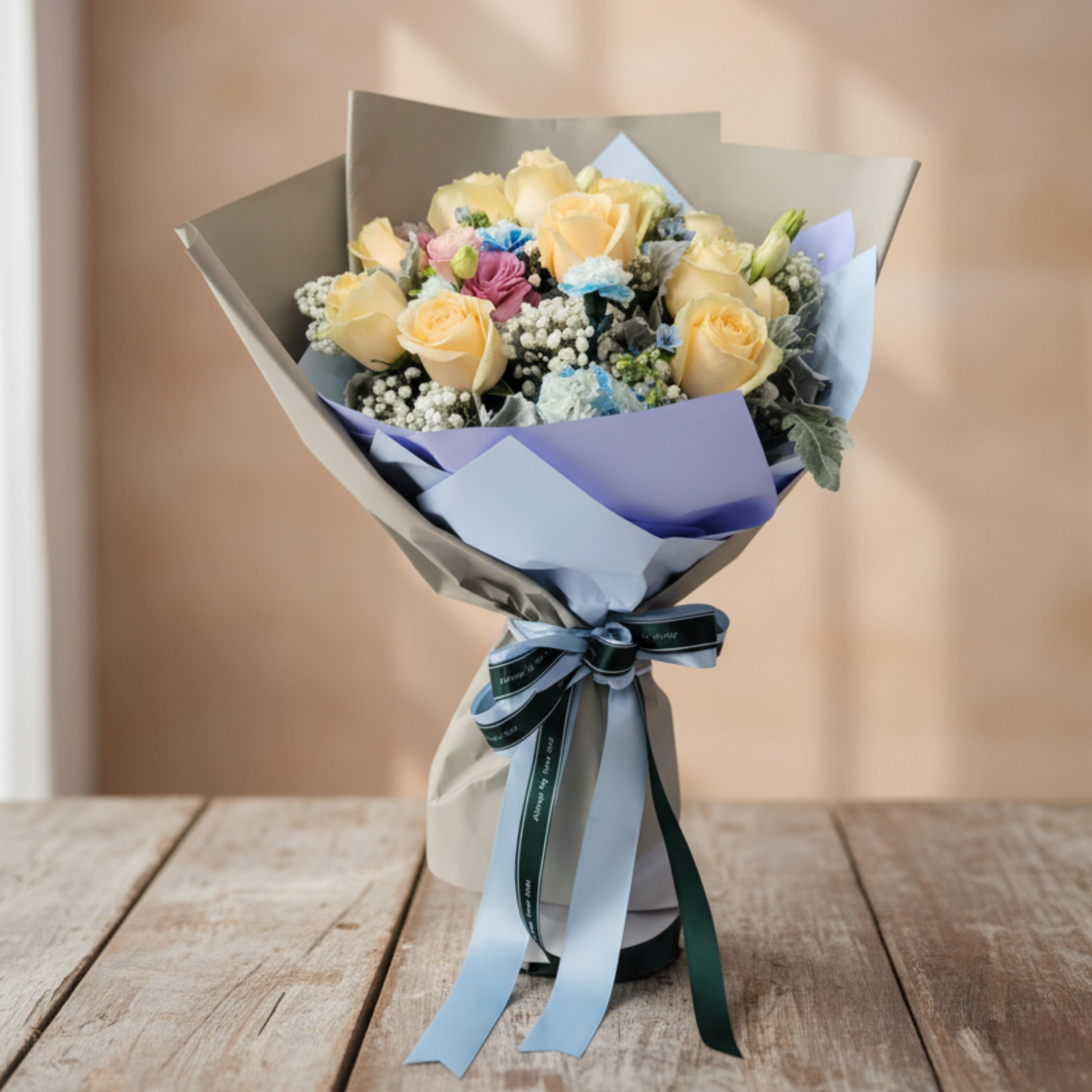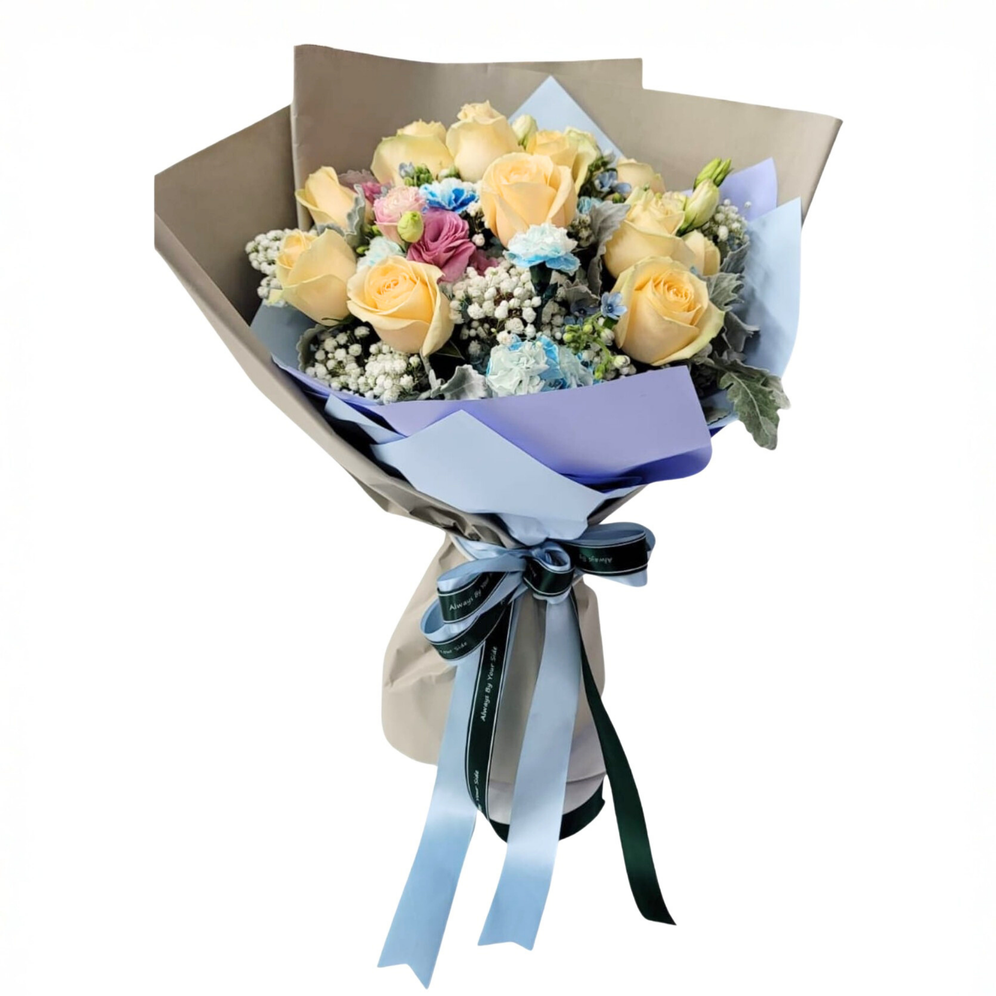 格蘭花店 - 鮮花花束 (玫瑰12枝、藍星花、桔梗、染色小丁、滿天星、米娜葉及其他襯花) [FB088]