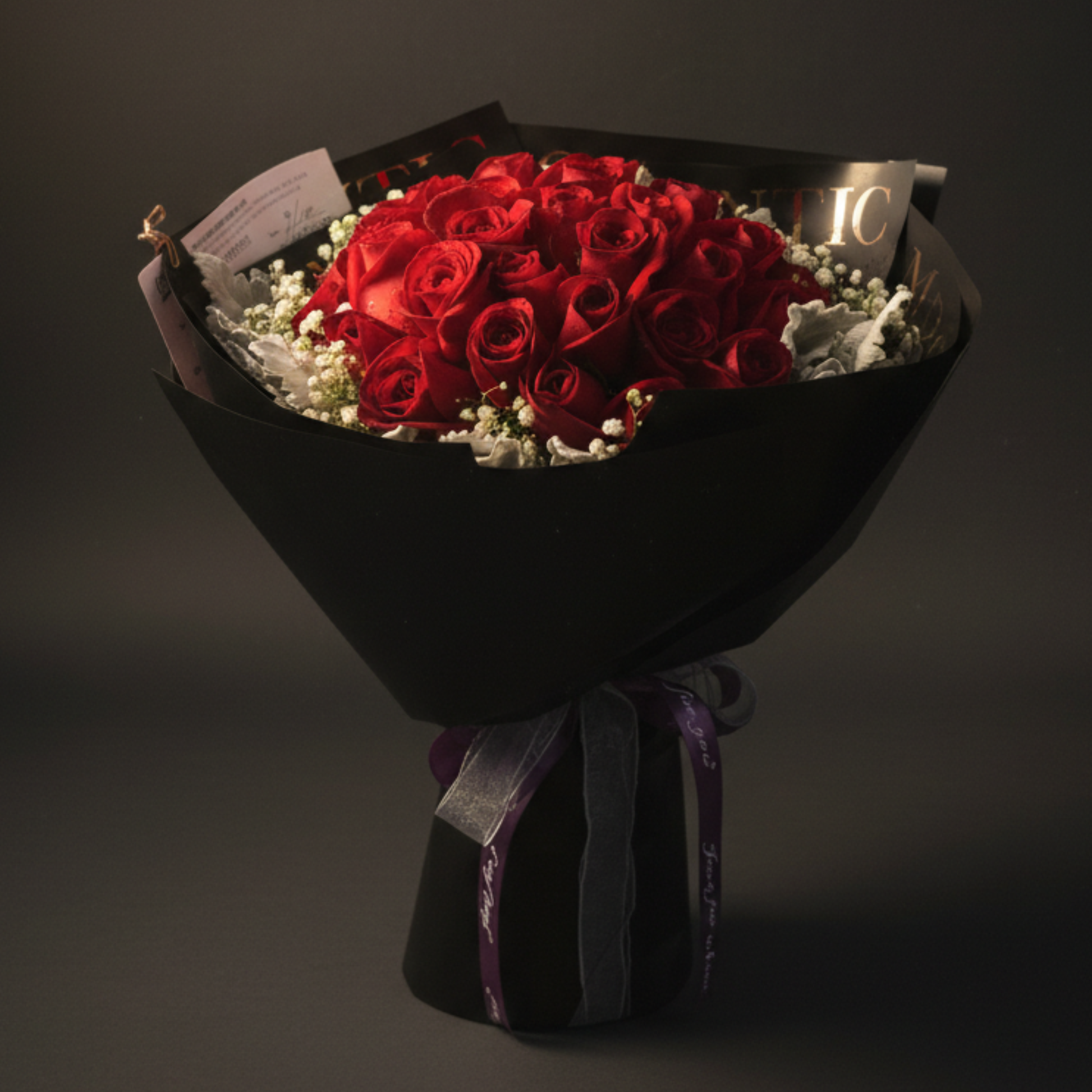 產品素材:紅玫瑰50枝、滿天星、米娜葉