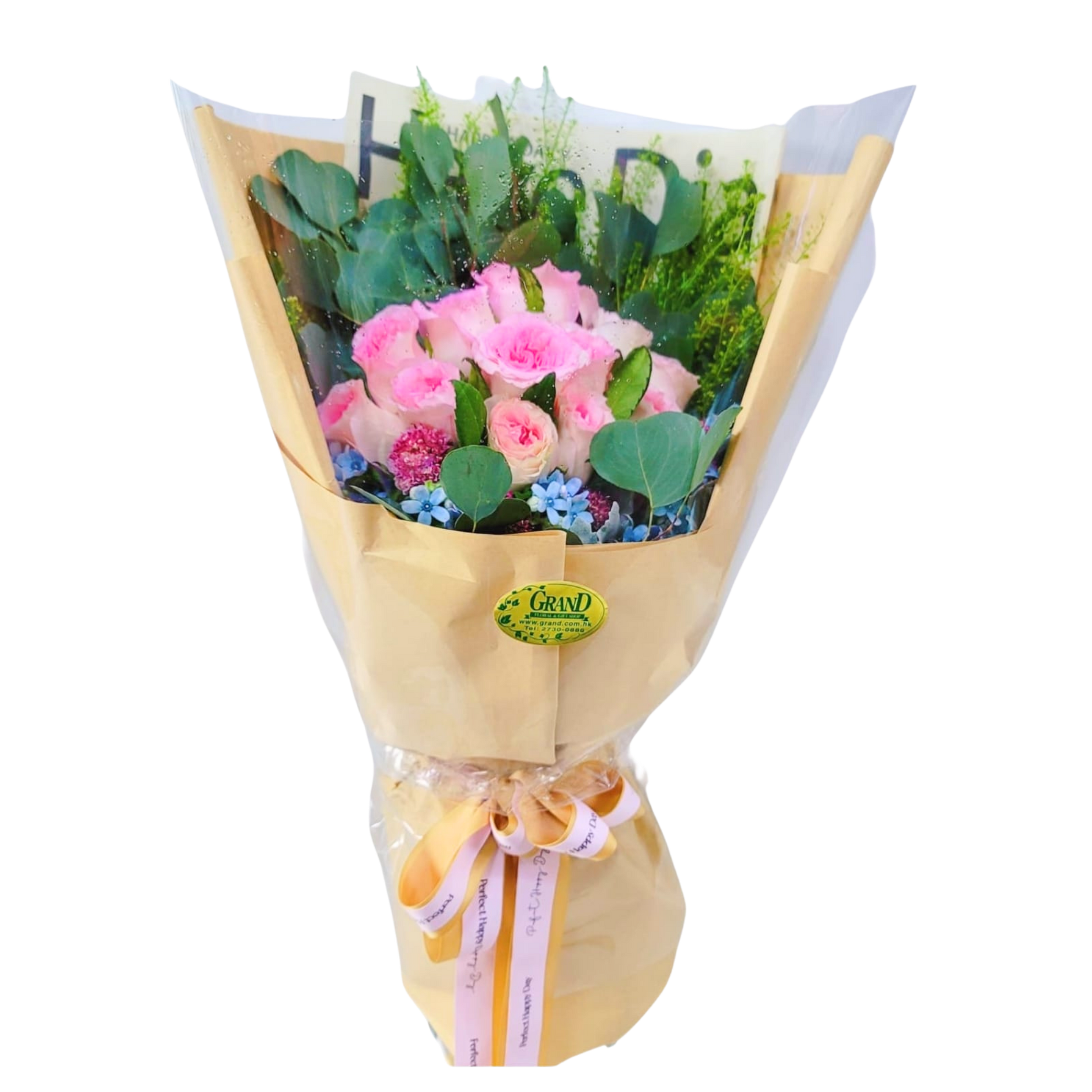 格蘭花店 - 鮮花花束 (玫瑰12枝、藍星花、蟲蟲草、尤加利葉及其他襯花) [FB097]