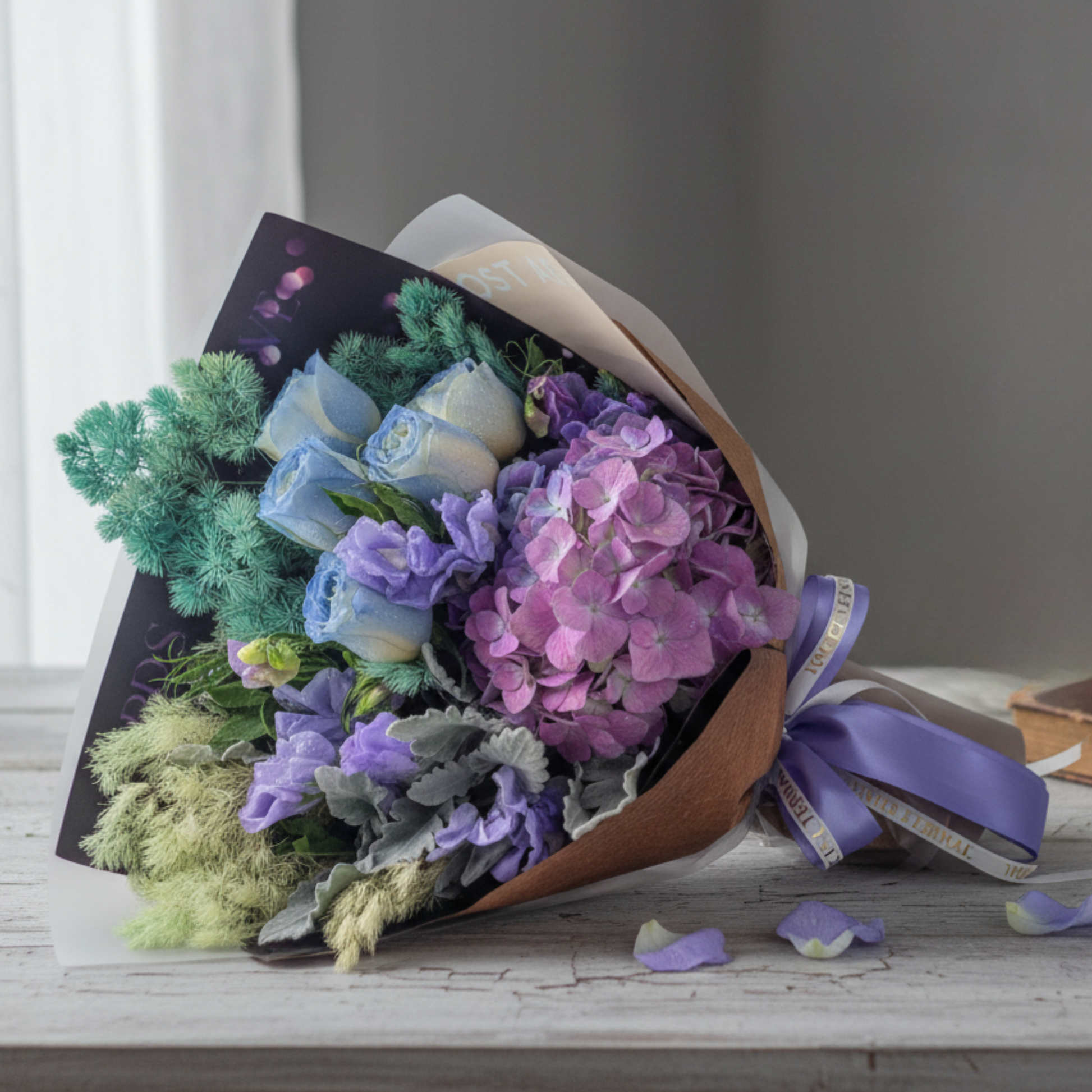 格蘭花店 - 鮮花花束 (玫瑰5枝、繡球花、米娜葉及其他襯花) [FB100]