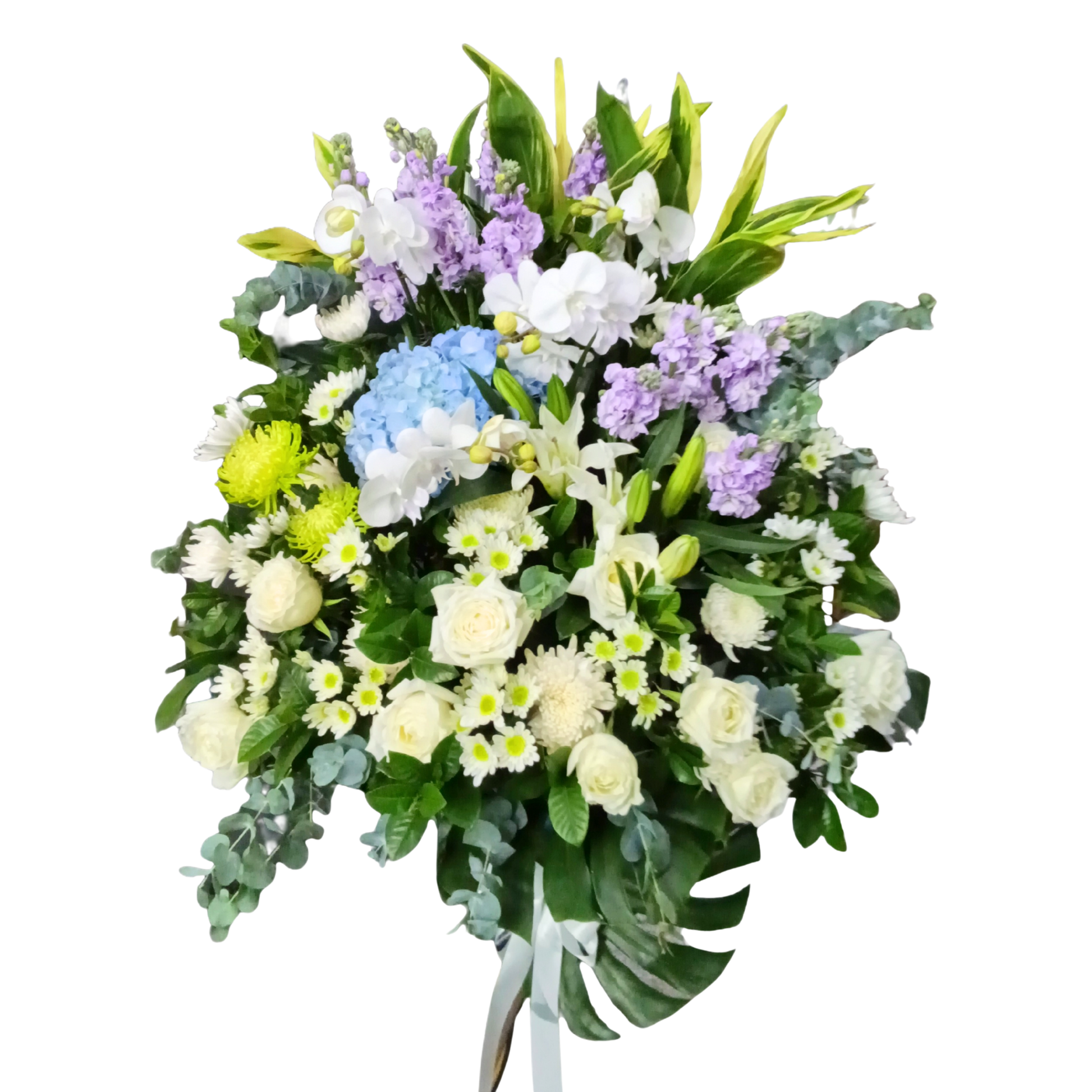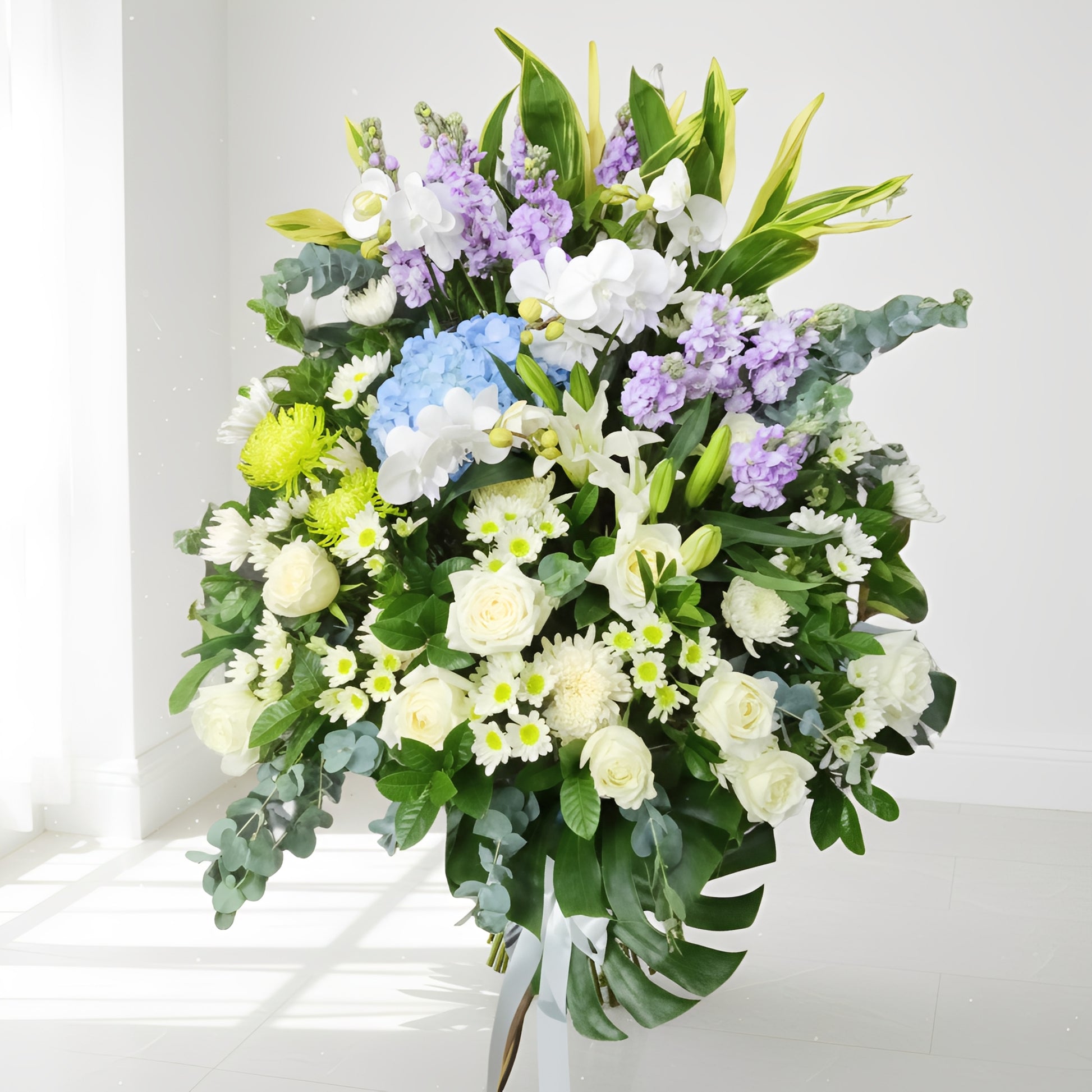 格蘭花店 - 白事花籃 (蝴蝶蘭、青鐵、日本麝香、白百合、小菊、牡丹菊、玫瑰、繡球花、大尤加莉葉及襯花) [FS0032] 喪禮 殯儀 告別式 追思會