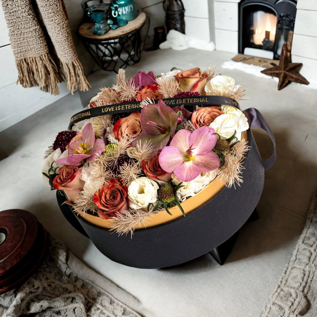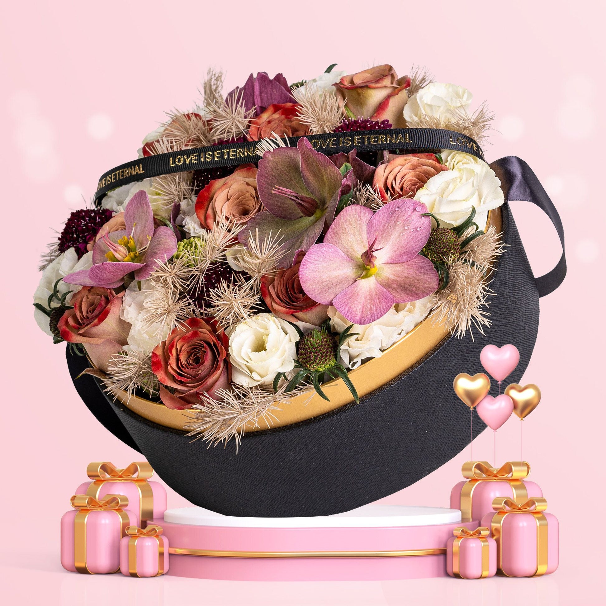 格蘭花店 - 圓形鮮花花盒 (混合玫瑰11枝+桔梗、小白合及襯花,配襯高級禮盒) [GF00088 / 7401753]