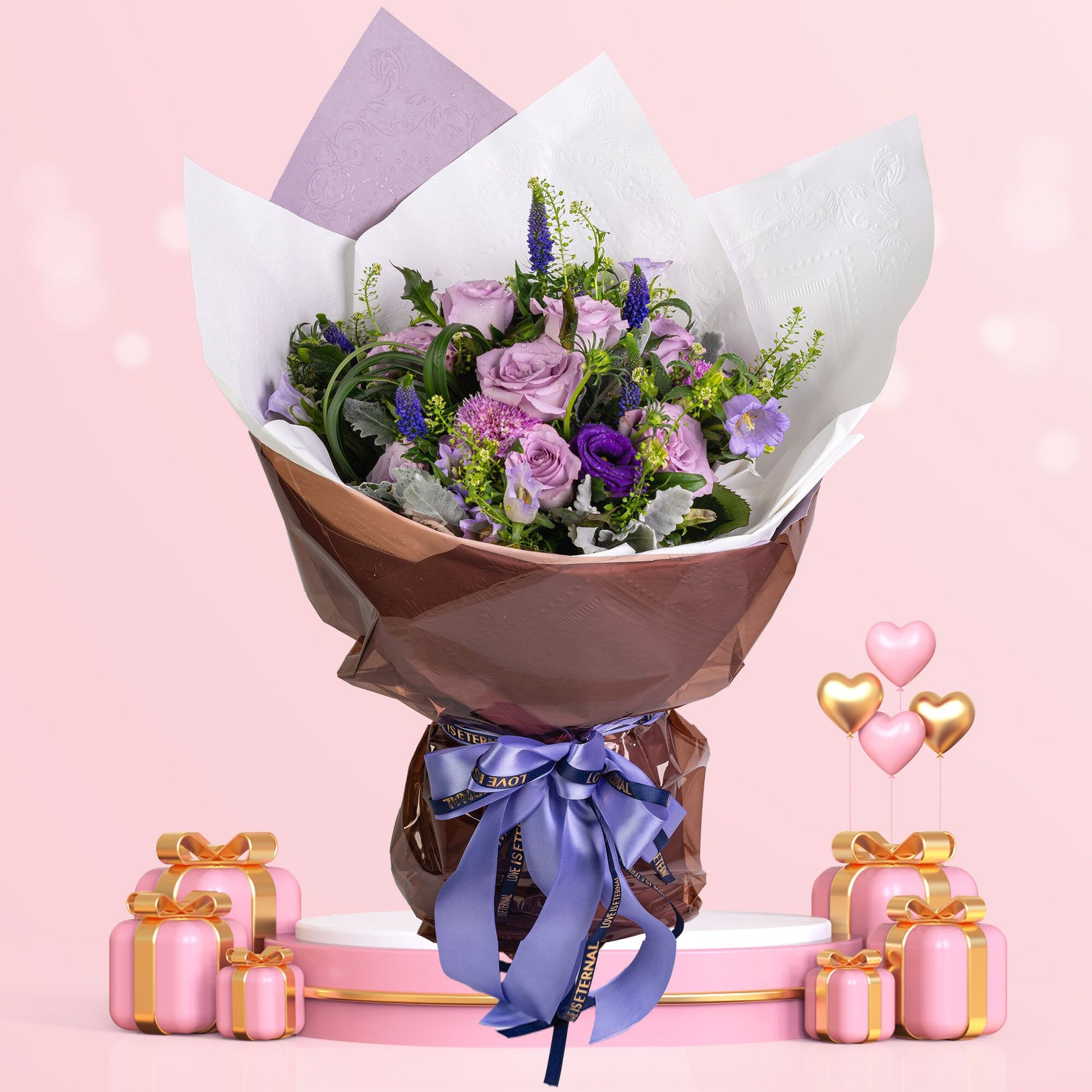格蘭花店 - 鮮花花束 (紫玫瑰11枝+老鼠尾、春蘭葉、風鈴、蟲蟲草、BB草、桔梗、米娜葉及襯花) [GF00095]