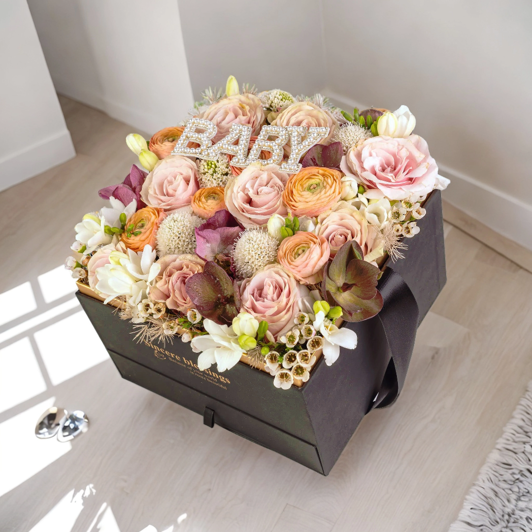 格蘭花店 - 方形鮮花花盒 (玫瑰9枝+小牡丹、較剪蘭、蟲蟲草、立梅及襯花) [GF00098]