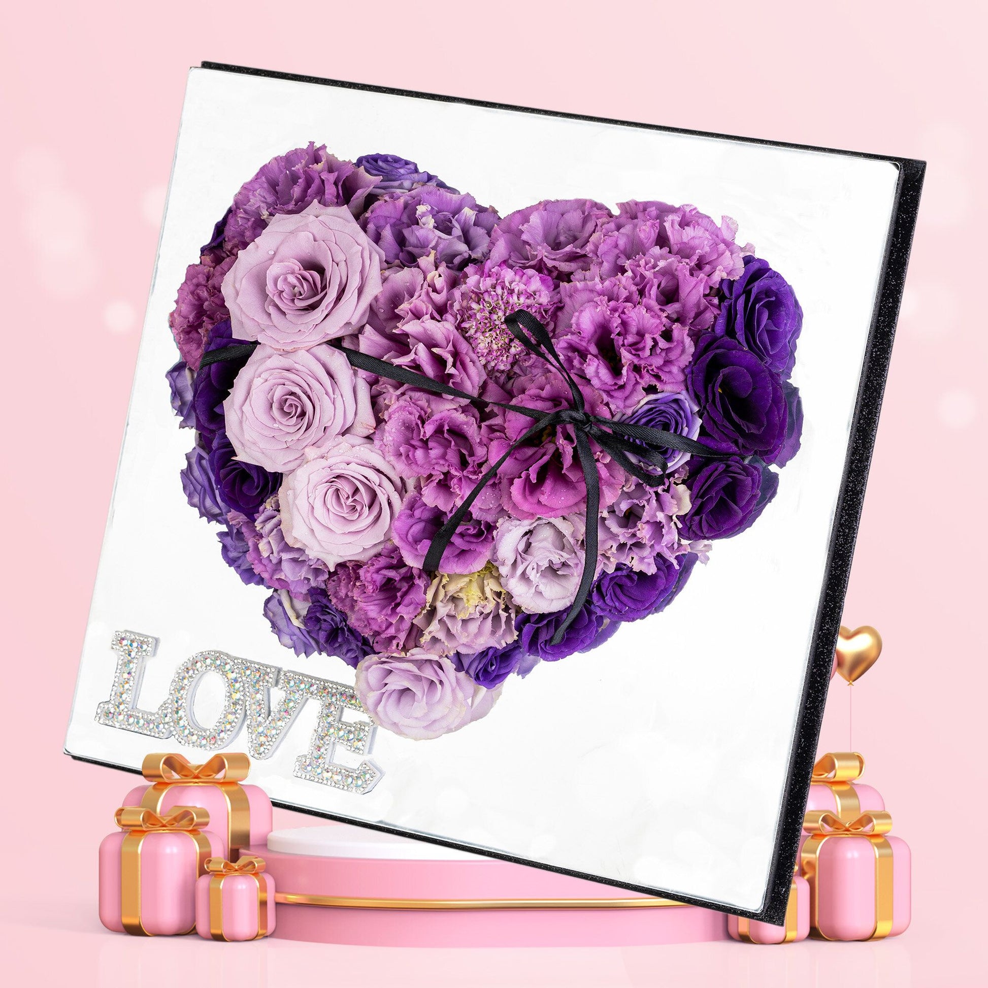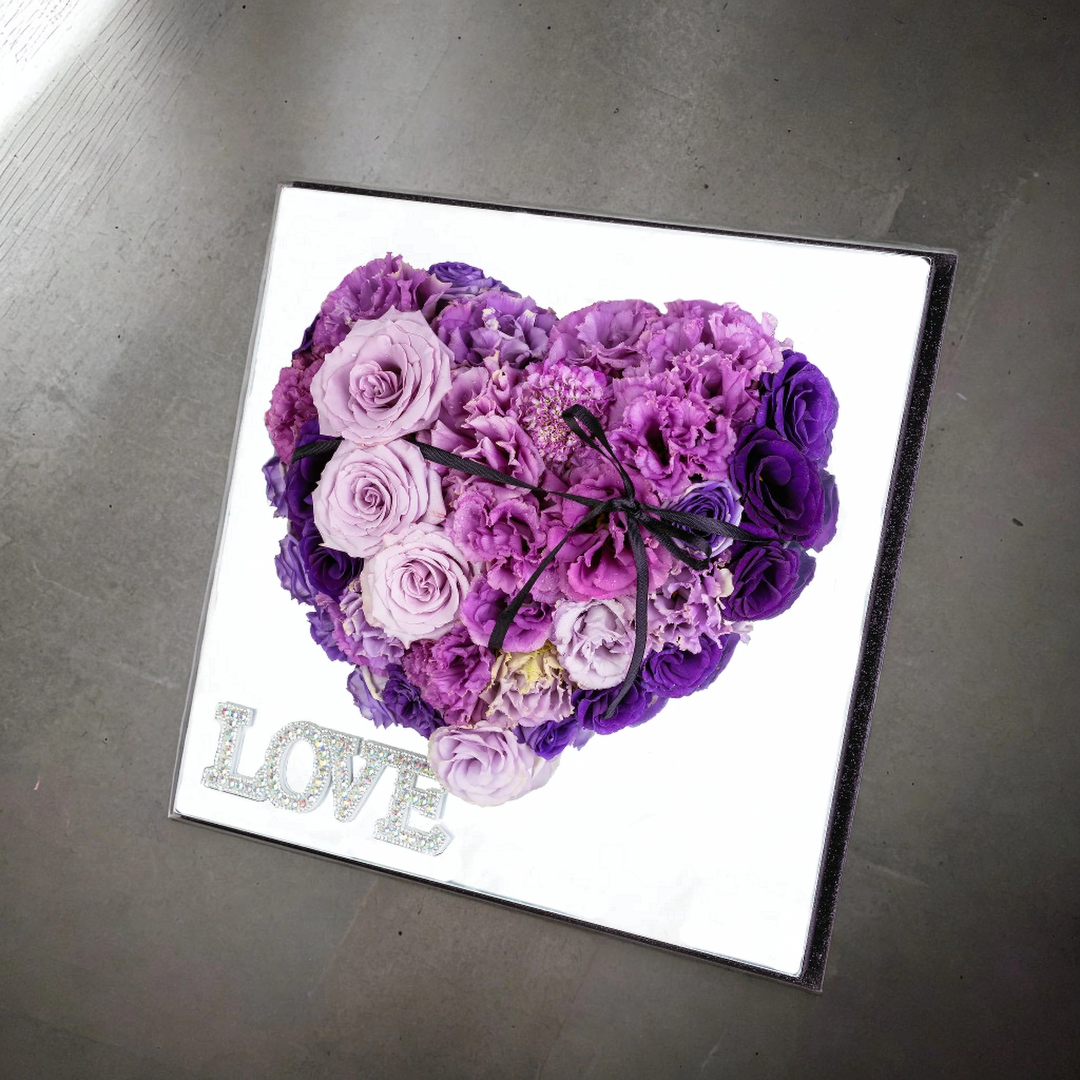格蘭花店 - 心形鮮花花盒 (紫玫瑰11枝+桔梗及襯花,配襯立體玻璃鏡面禮盒) [GF00099]