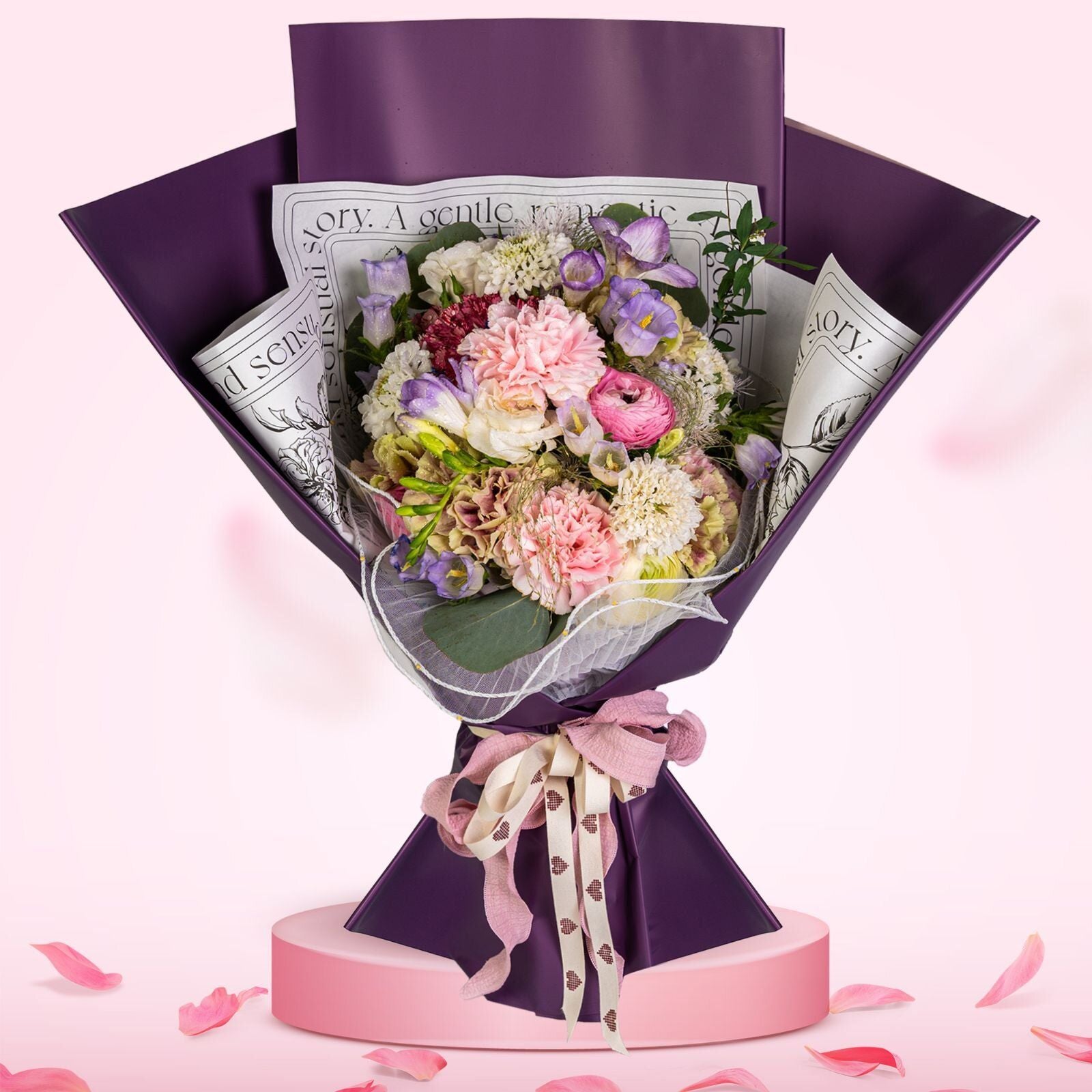格蘭花店 - 鮮花花束 (康乃馨9支、桔梗、風鈴、小牡丹、噴泉草、米娜葉) [GF00120]