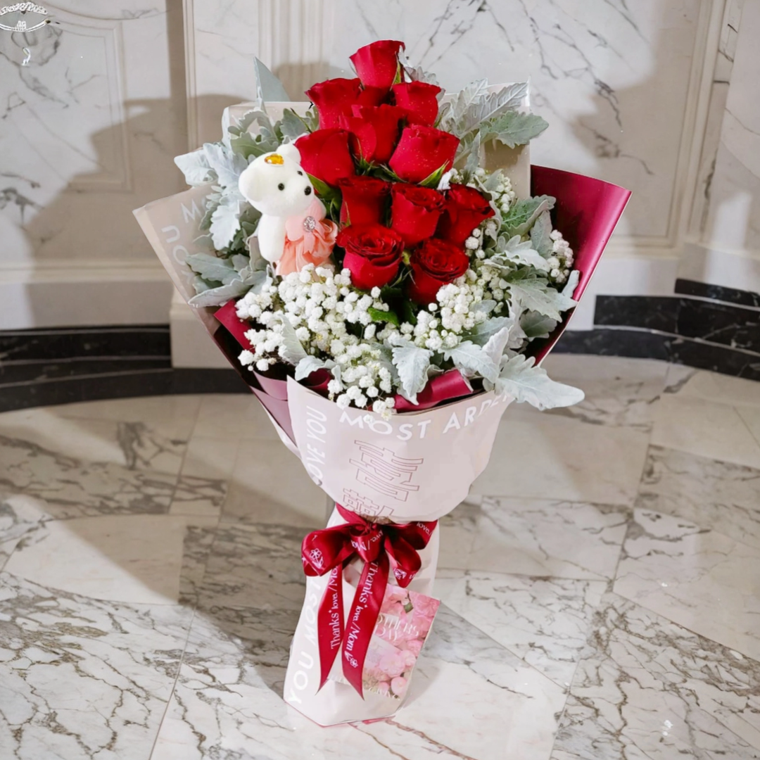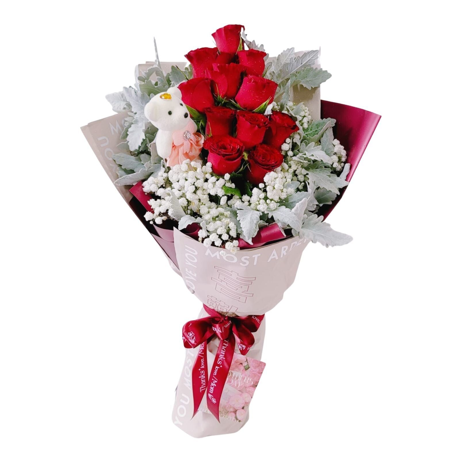 格蘭花店 - 鮮花花束 (玫瑰12支、滿天星、銀葉菊) [GF00126]