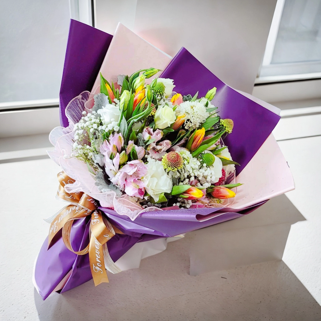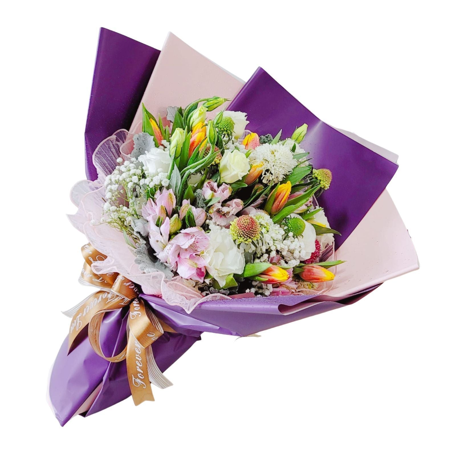 格蘭花店 - 鮮花花束 (鬱金香10枝、小白合、蟲蟲草、桔梗、滿天星、米蘭葉) [GF00179]