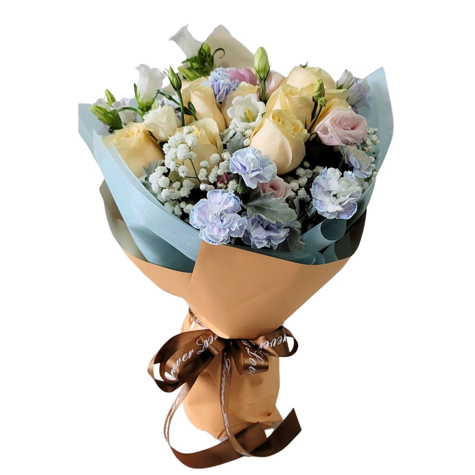 格蘭花店 - 鮮花花束 (香檳玫瑰12支、小丁香、 風鈴花、桔梗、滿天星、米蘭葉) [GF00182]