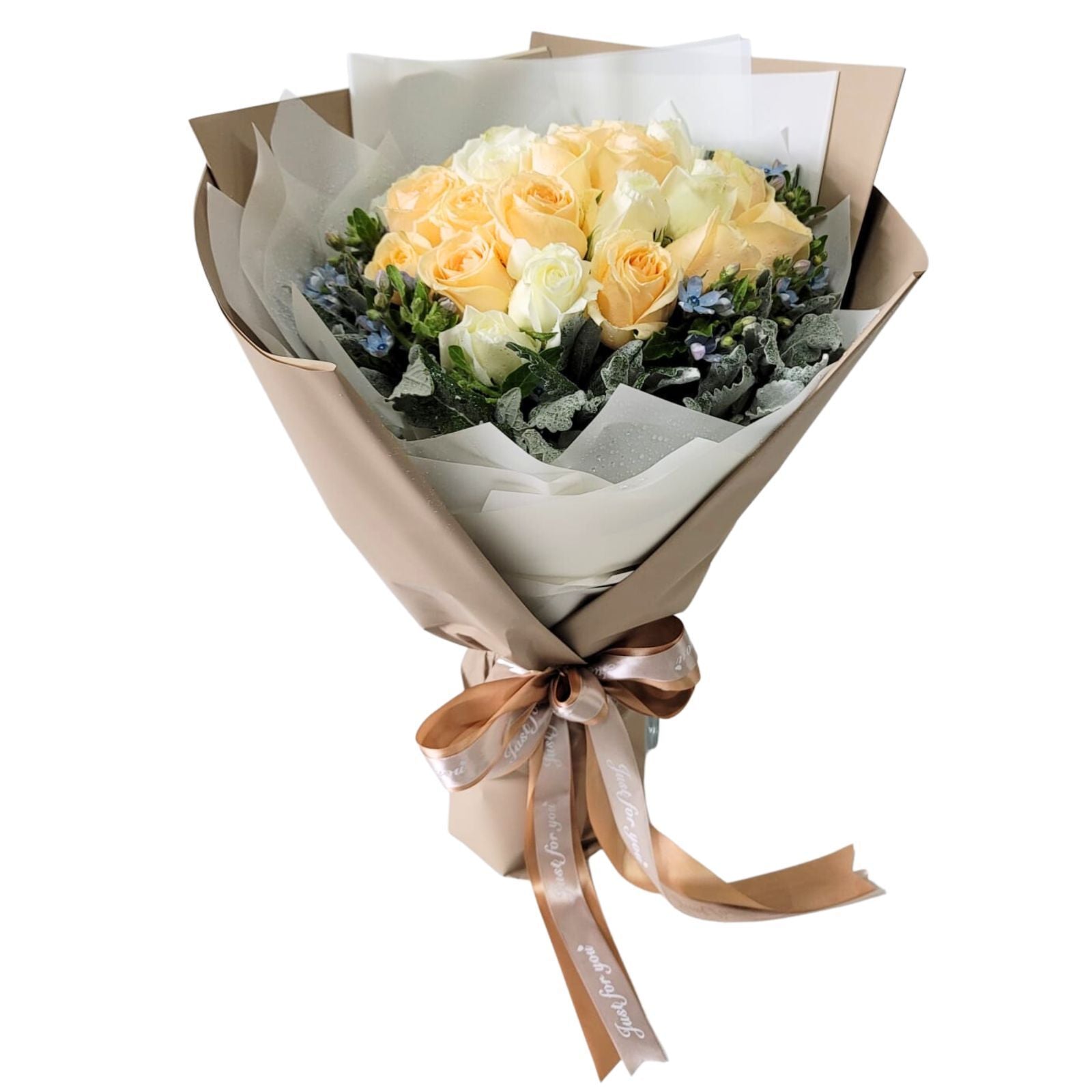 格蘭花店 - 鮮花花束 (香檳玫瑰及白玫瑰共24枝、藍星花 、銀葉菊) [GF00183]