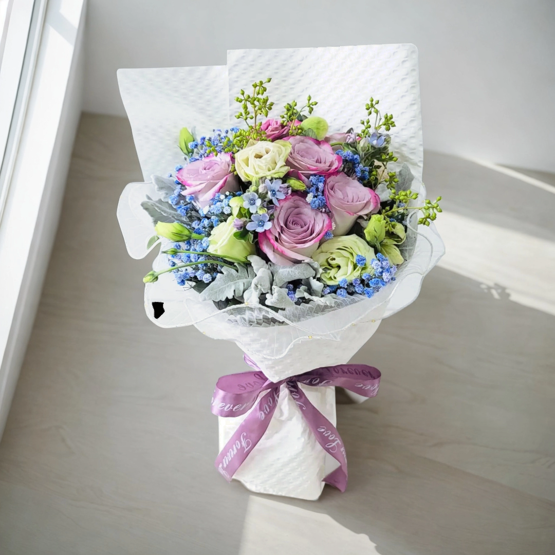 格蘭花店 - 鮮花花束 (紫色玫瑰6支、青桔梗、米娜葉、藍色滿天色及尤加利果) [GF00195]
