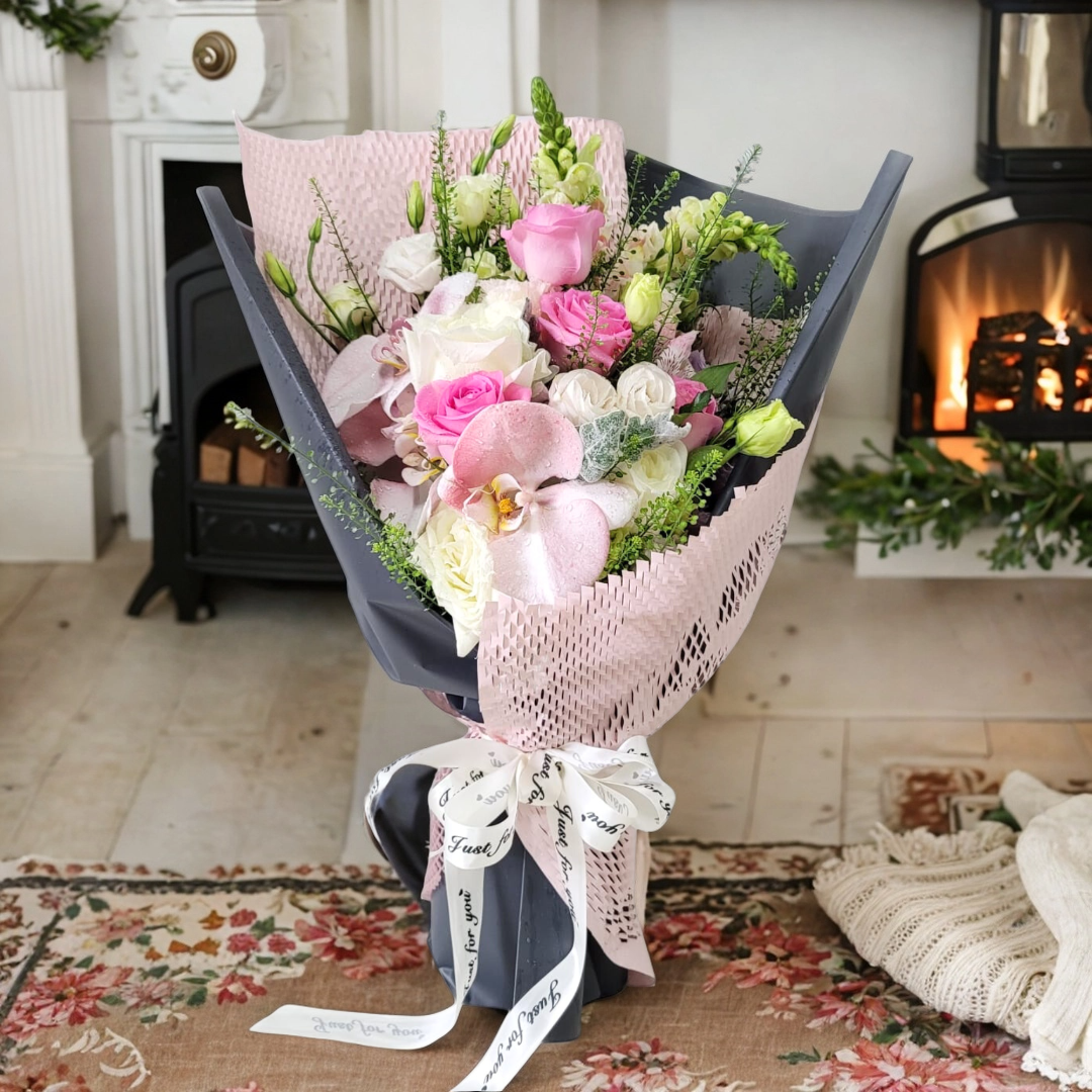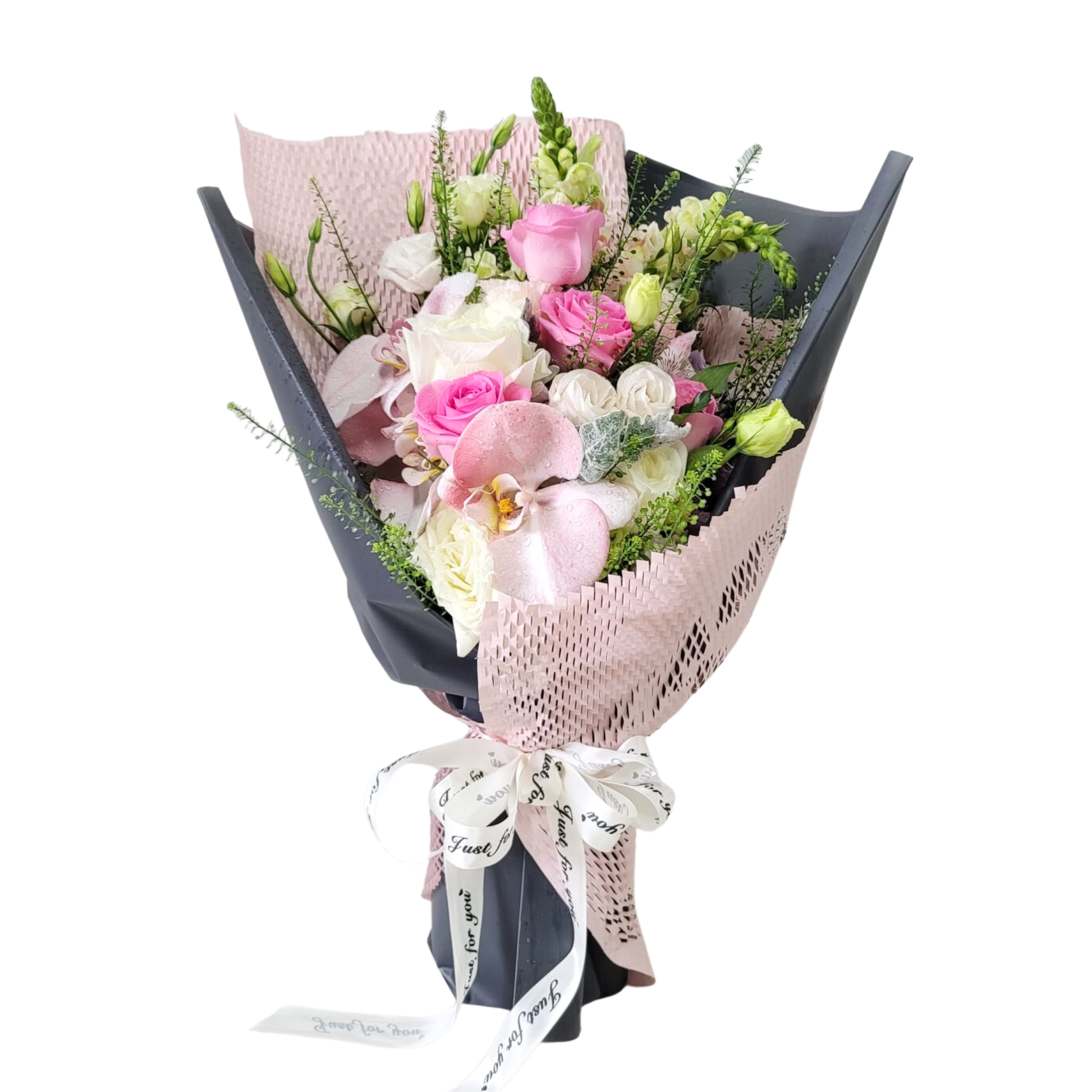 格蘭花店 - 鮮花花束 (粉玫瑰9支、蝴蝶蘭、桔梗、BB草、米娜葉及小百合) [GF00220]