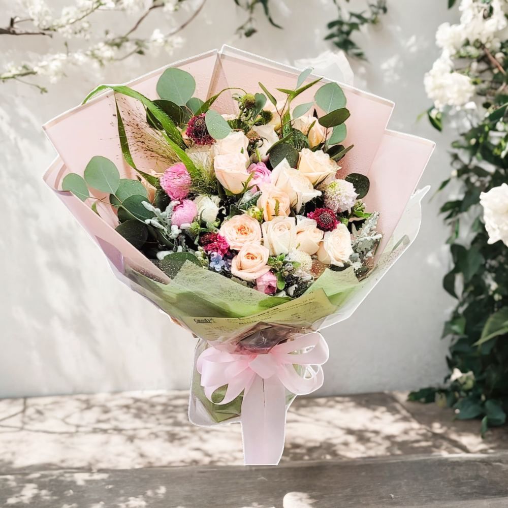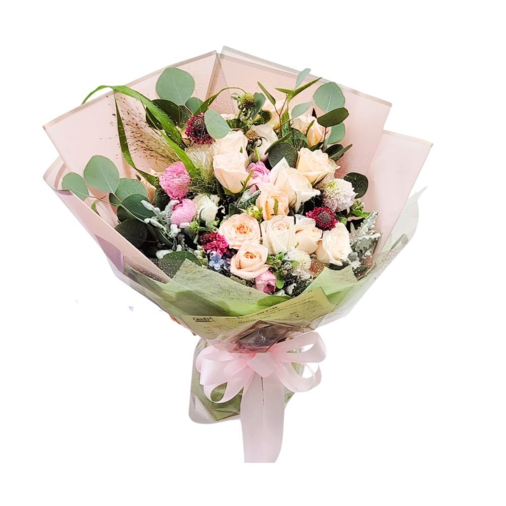 格蘭花店 - 鮮花花束 (玫瑰花18支、小牡丹、噴泉草、尤加利葉、蟲蟲草) [GF00246]
