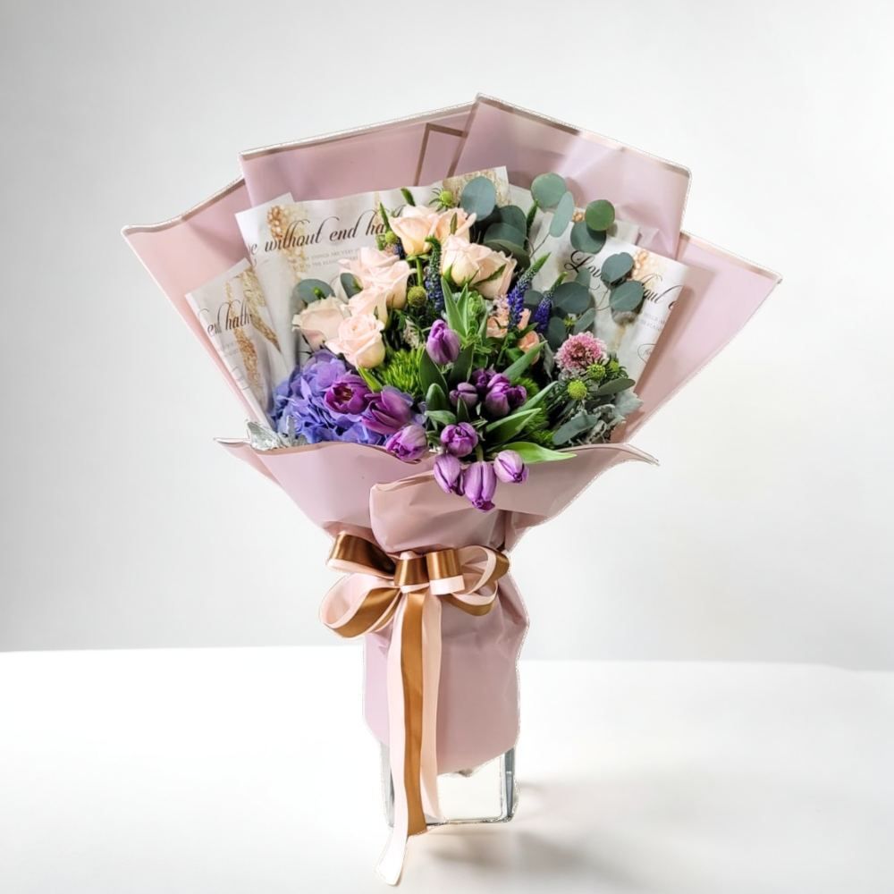 格蘭花店 - 鮮花花束 (鬱金香10支、玫瑰6支、繡球花、蟲蟲草、尤加利葉) [GF00247]