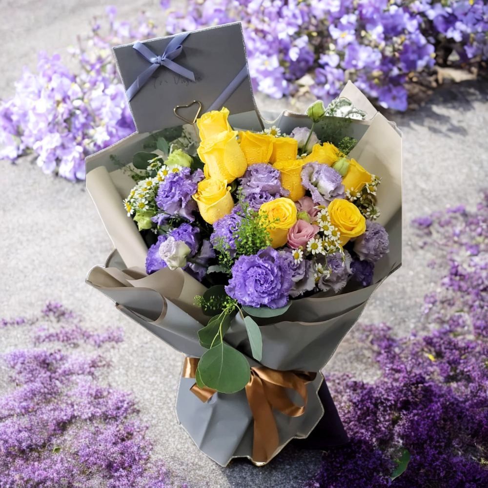 格蘭花店 - 鮮花花束 (黃玫瑰12支、桔梗、BB草、洋甘菊、米娜葉) [GF00250]