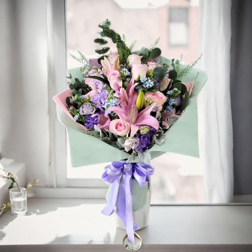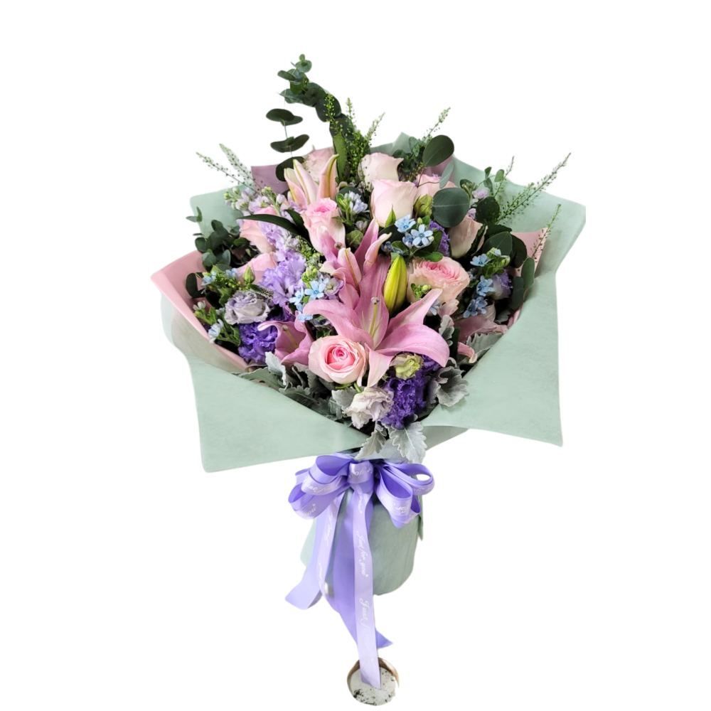 格蘭花店 - 鮮花花束 (玫瑰、粉百合、藍星花、BB草、尤加利葉) [GF00252]