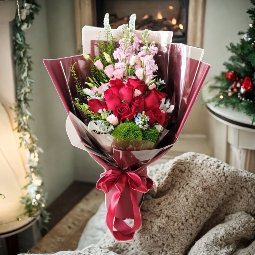 格蘭花店 - 鮮花花束 (紅玫瑰12支、麝香、桔梗、BB草、綠毛球) [GF00253]