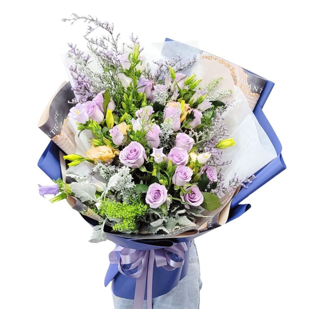 格蘭花店 - 鮮花花束 (紫玫瑰18支、BB草、彩星、米娜葉、風鈴、桔梗) [GF00287]