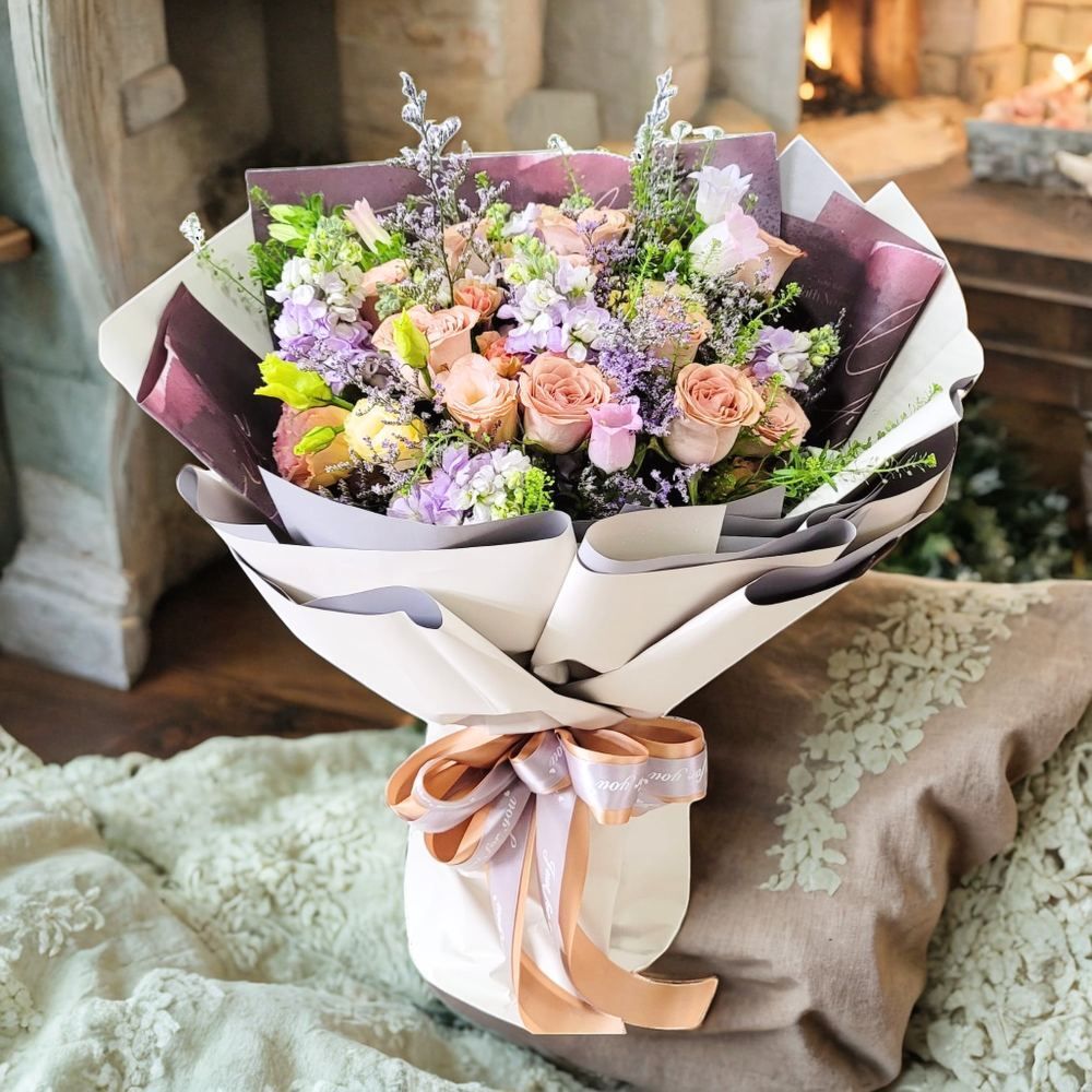 格蘭花店 - 鮮花花束 (朱古力玫瑰11支、麝香、BB草、桔梗、風鈴、米娜葉、小丁香) [GF00297]