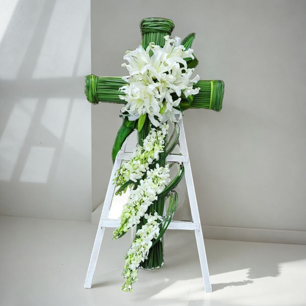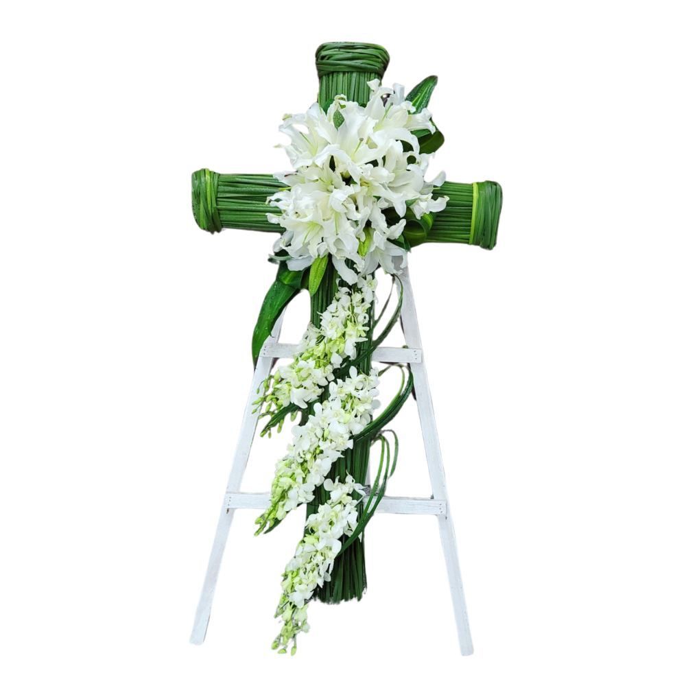 格蘭花店 - 十字架帛事悼念花圈 (5尺高) (水祝草、白百合、大白蘭) [GF00298] 喪禮 殯儀 告別式 追思會