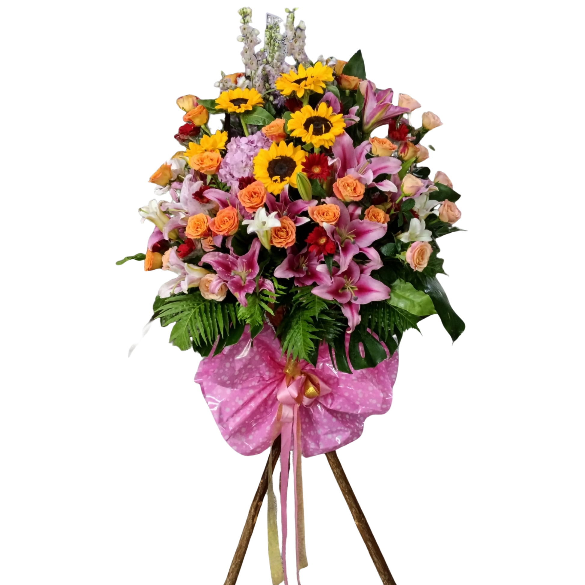 產品素材:繡球花、火百合、大飛燕、向日葵、玫瑰、太陽花及其他襯花