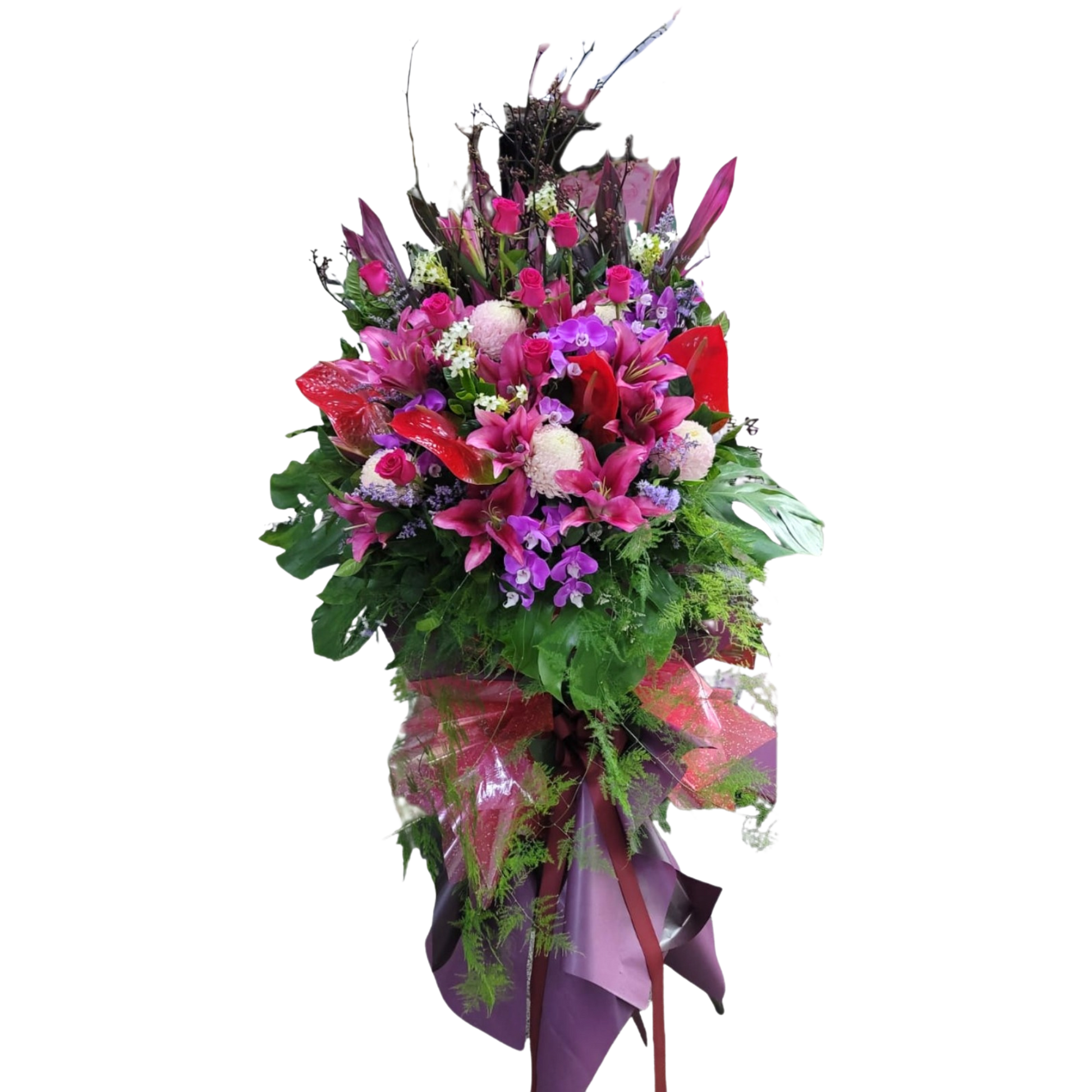 產品素材:波波菊、火百合、大紅掌、紅玫瑰、蝴蝶蘭、大眼雀梅、紅鐵葉、龜背葉及其他襯花